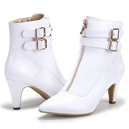 • CUTE TWO BUCKLE STRAP & FRONT AND SIDE ZIPPER: Double strap with two big buckles shows more charm and stylish, metal element shows a strong personality and fashion characteristics. Front decorative zipper makes booties more eye-catching, side zipper saves time when you're on the go, wear all seasons