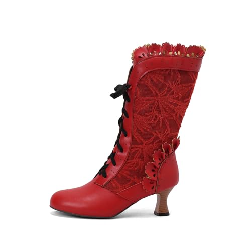 Victorian Boots for Women,Women's Bow Ruffles Goth Boots Costume Lace Up Retro Boot Halloween Witch Stuff Cuban Heel Mid Calf Vintage Shoes 5