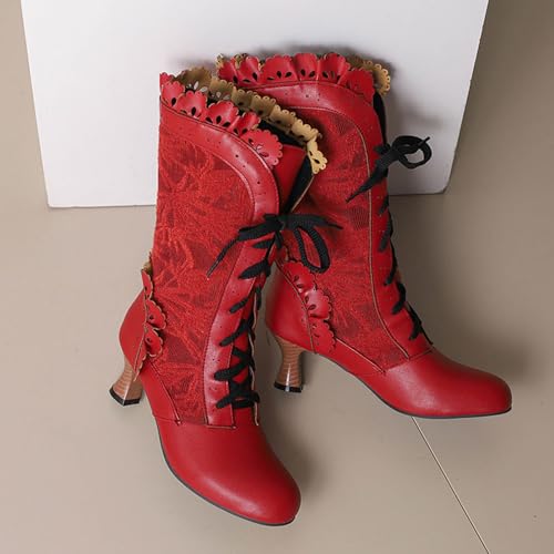 Victorian Boots for Women,Women's Bow Ruffles Goth Boots Costume Lace Up Retro Boot Halloween Witch Stuff Cuban Heel Mid Calf Vintage Shoes 6