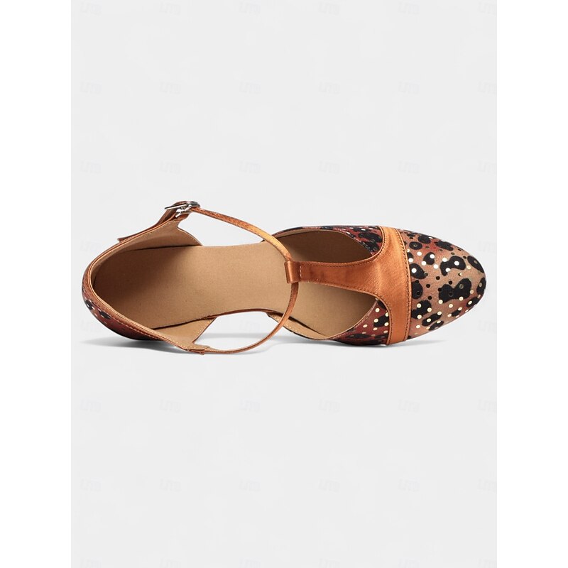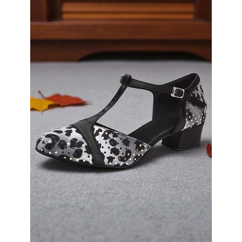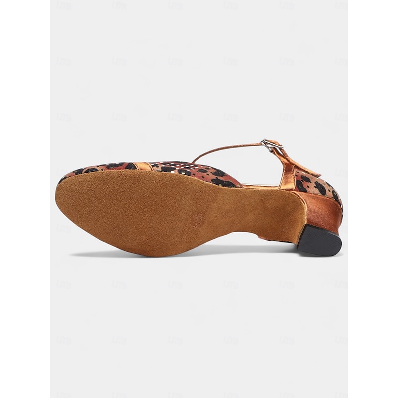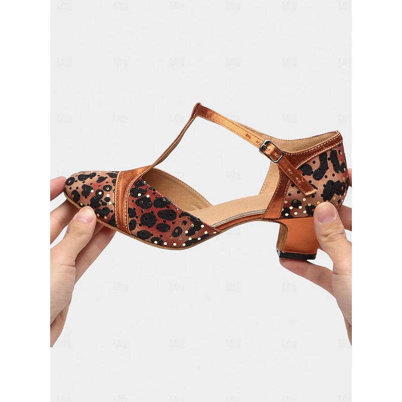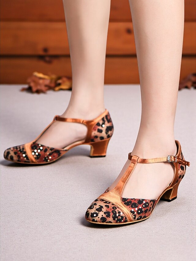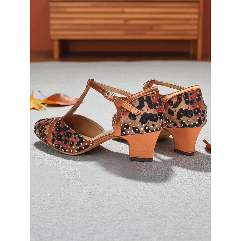Women's Leopard Print Satin T-Strap Dance Shoes with Low Heel - Professional Ballroom and Latin Performance Footwear 1
