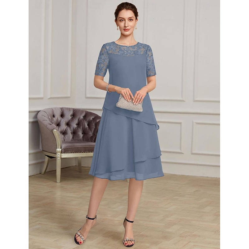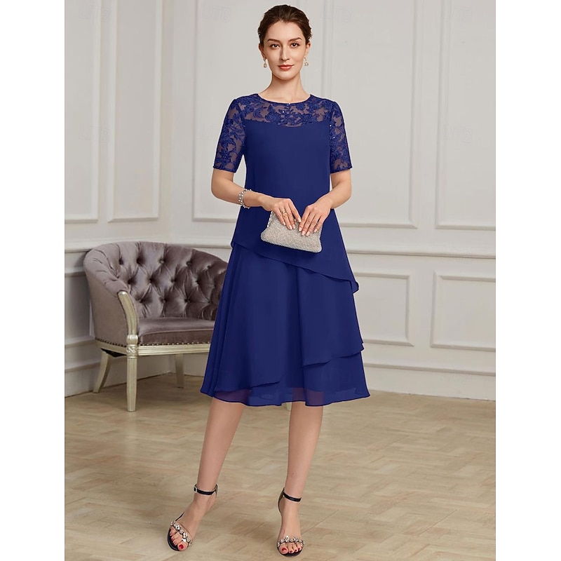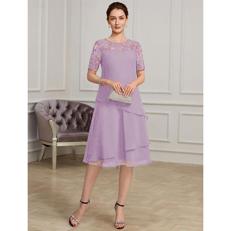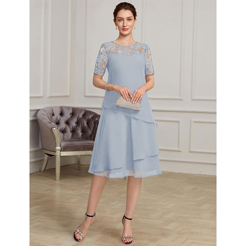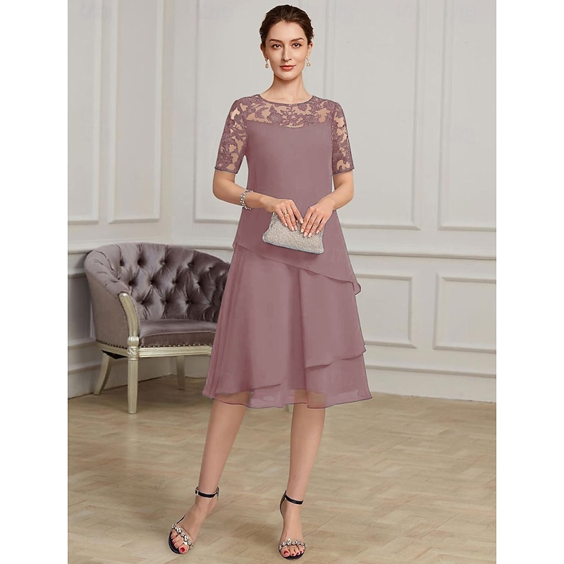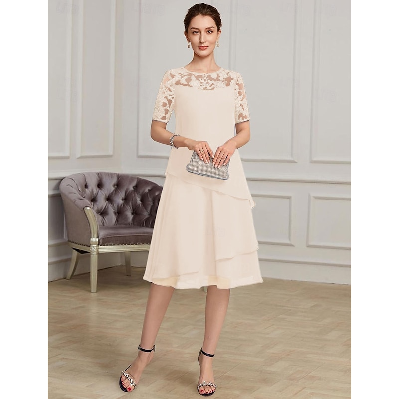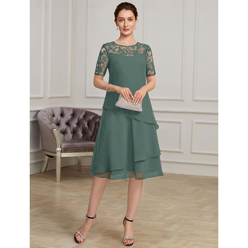 A-Line Mother of the Bride Dress Formal Elegant Jewel Neck Tea Length Chiffon Short Sleeve with Lace