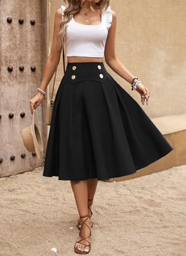 Herou Women's Casual Vintage Pleated A-Line Flared High Waist Elastic Button Front Black Midi Skater Skirt 1