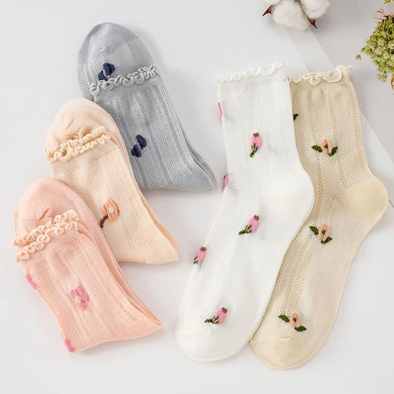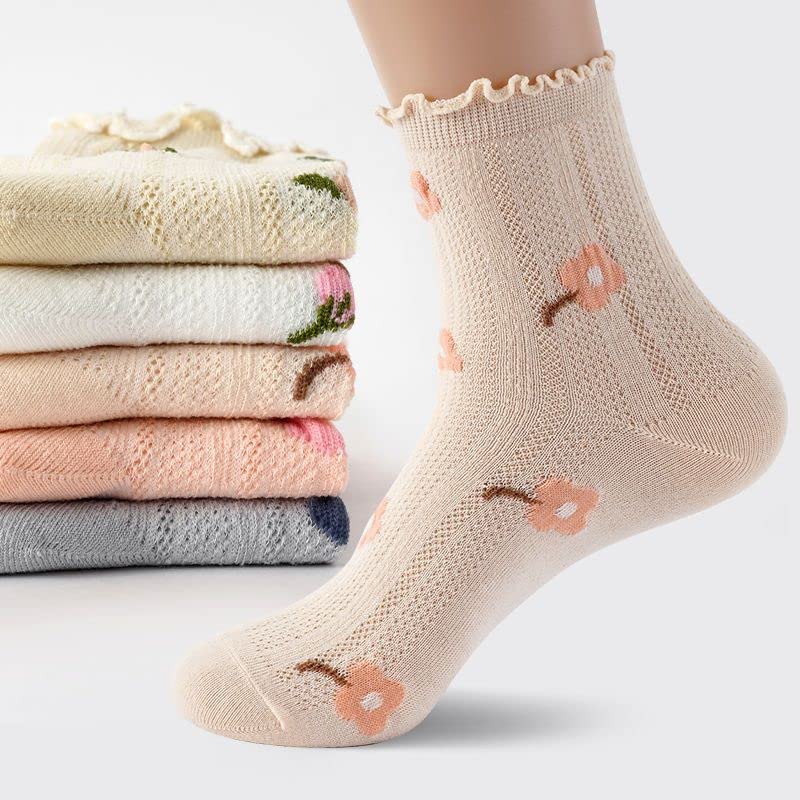 Cute Kawaii Multi Colored Floral Mesh Non-Binding Socks For Women, Size 5-8, Pack of 5 5