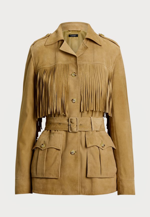 More information about FRINGE TRIM BELTED GOAT SUEDE JACKET - Leather jacket - camel