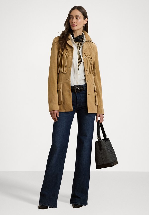 FRINGE TRIM BELTED GOAT SUEDE JACKET - Leather jacket - camel 1