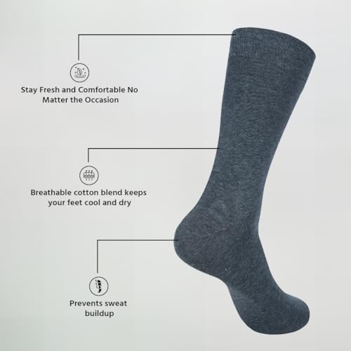 • BREATHABLE AND MOISTURE-WICKING: Thanks to the breathable cotton blend, these trouser socks are designed to keep your feet dry and cool throughout the day. The material effectively wicks moisture away, preventing discomfort caused by sweat, even during extended wear. This makes them an excellent choice for those who spend long hours in formal settings or need to look sharp and feel fresh from morning to night.