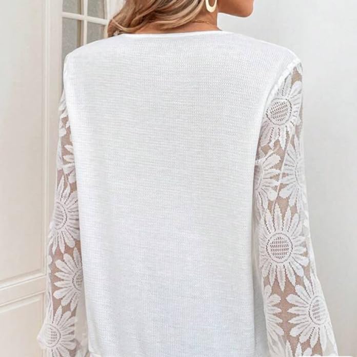 Chvity Long Sleeve Lace Tops for Women Casual Fashion Sheer Mesh V Neck Loose Ladies Blouse Shirts Fit Comfy 4