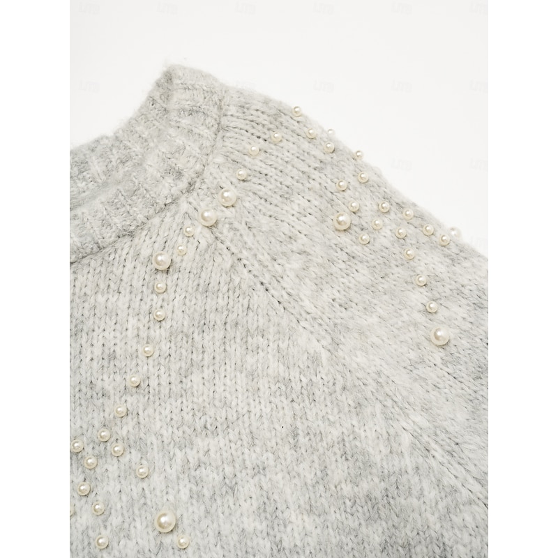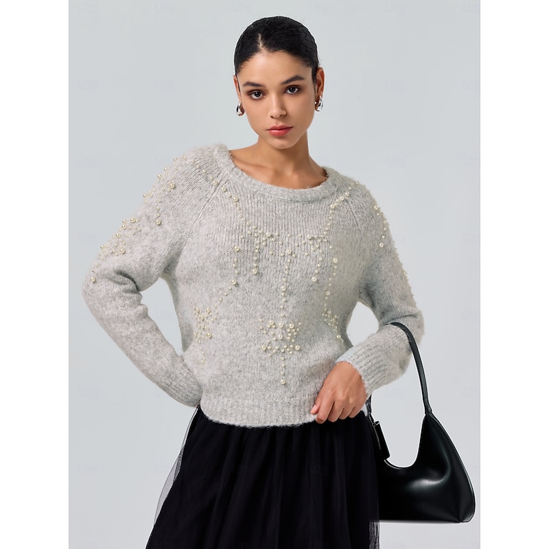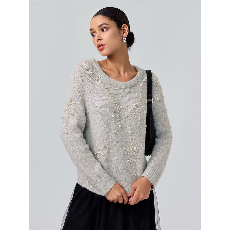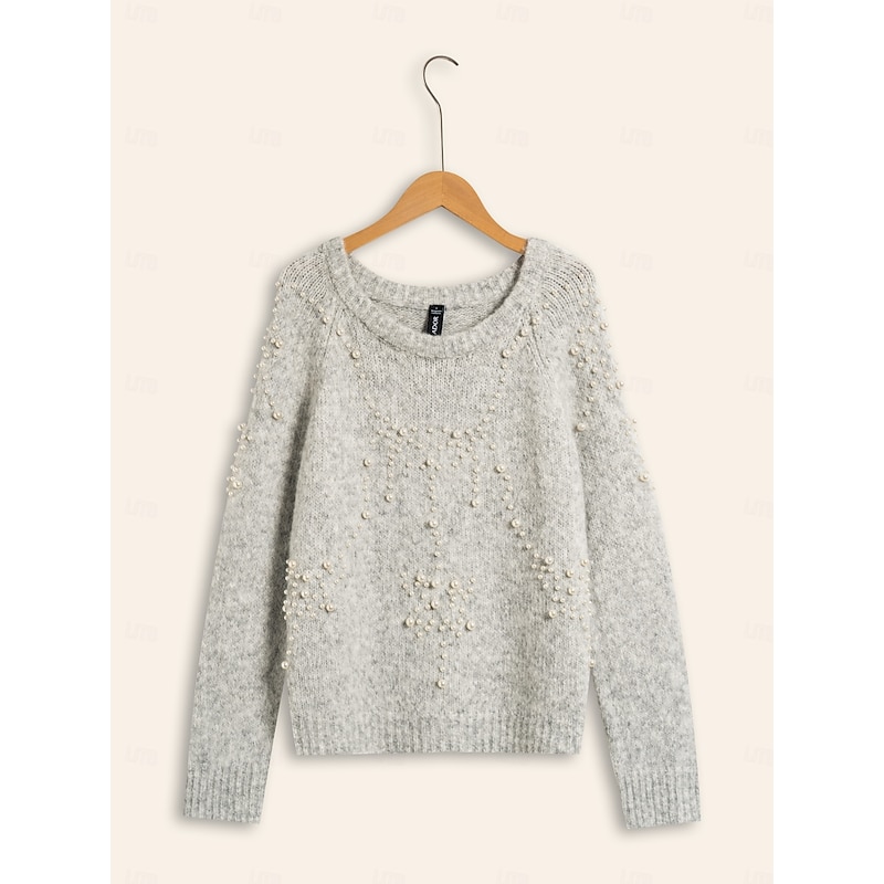 HOT ! Women's Gray Pearl Beaded Crew Neck Long Sleeve Knit Pullover Sweater Jumper Casual Daily Fall Winter