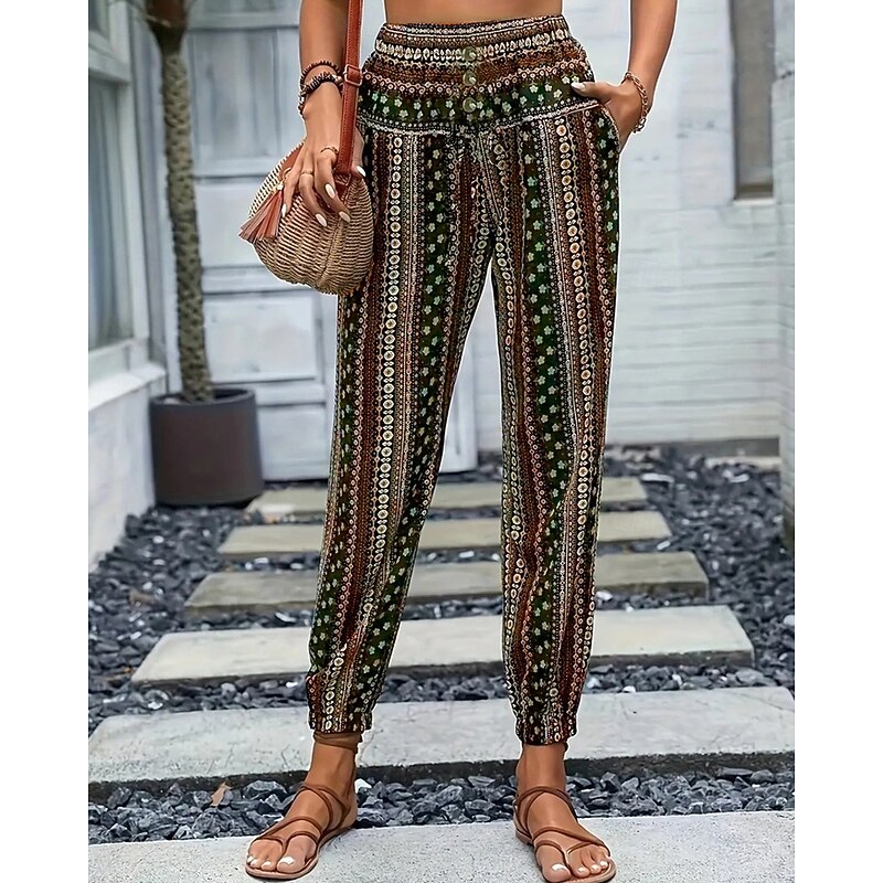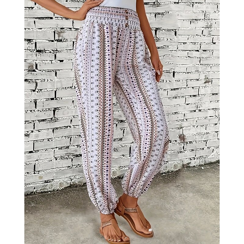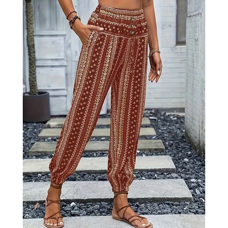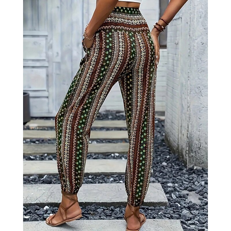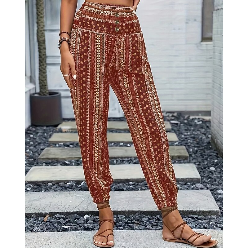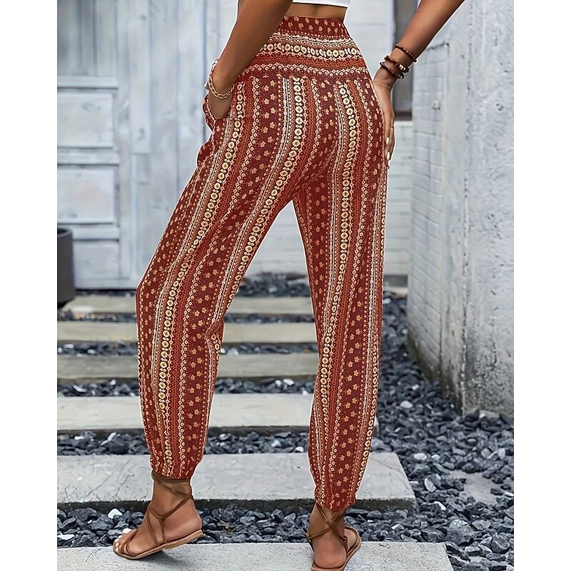 Women's Joggers Pants Trousers Vacation Boho Full Length Mid Waist Geometic Elastic Waist Breathable Comfortable Micro-elastic Street Daily Wear Going out Dark Brown White Red Dark Green Summer 25