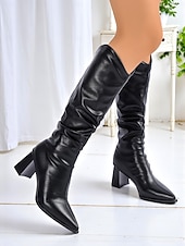 More information about Women's Black Faux Leather Knee High Boots with Pointed Toe and Block Heels, Chic Slouchy Style Fashion Boots for Parties, Night Out & Fall Winter Outfits