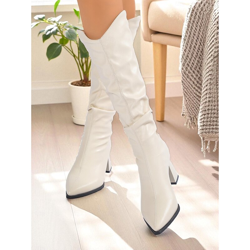 HOT ! Women's Black Faux Leather Knee High Boots with Pointed Toe and Block Heels, Chic Slouchy Style Fashion Boots for Parties, Night Out & Fall Winter Outfits
