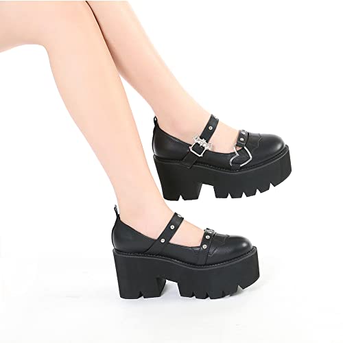 Tscoyuki Women's Platform Ankle Strap Chunky Heels Pumps, Cute Mary Jane Wedges Gothic Shoes 5