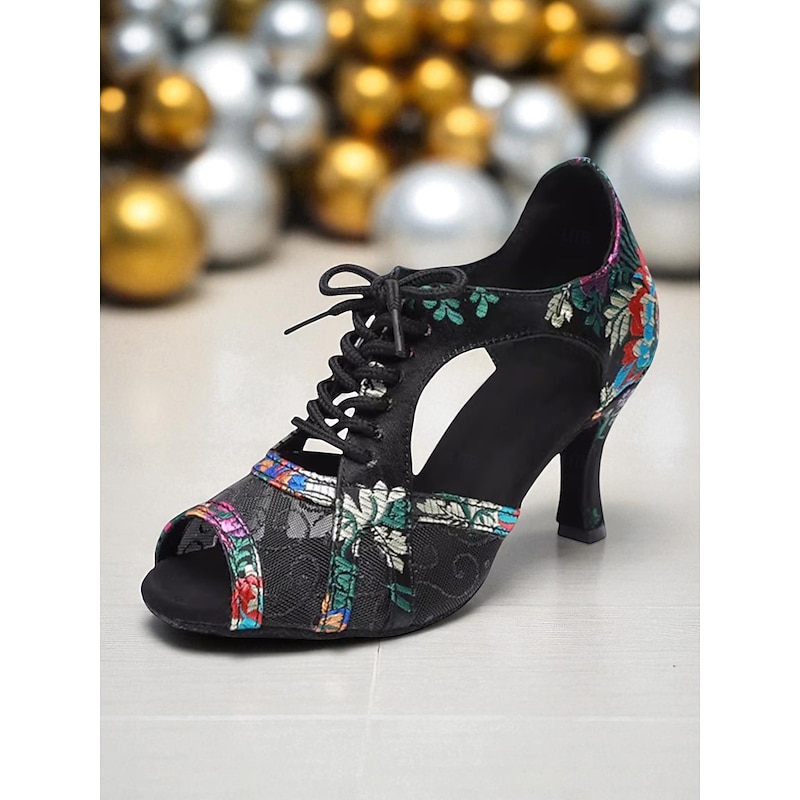 Women's Lace-Up Latin Dance Shoes with Embroidered Mesh Design - Professional Ballroom Heels for Performance and Party Wear 1