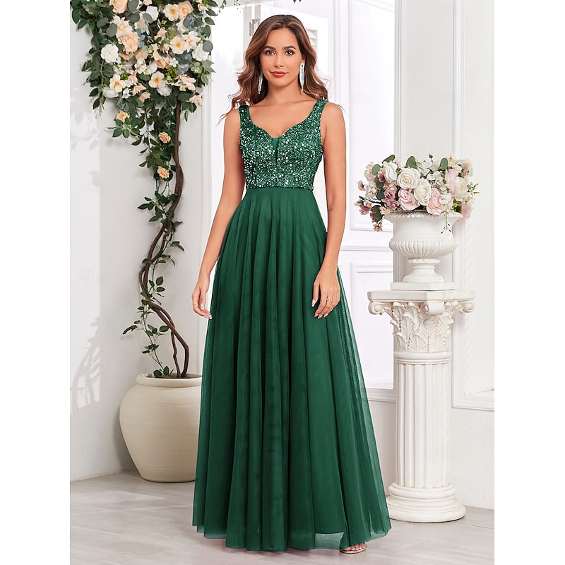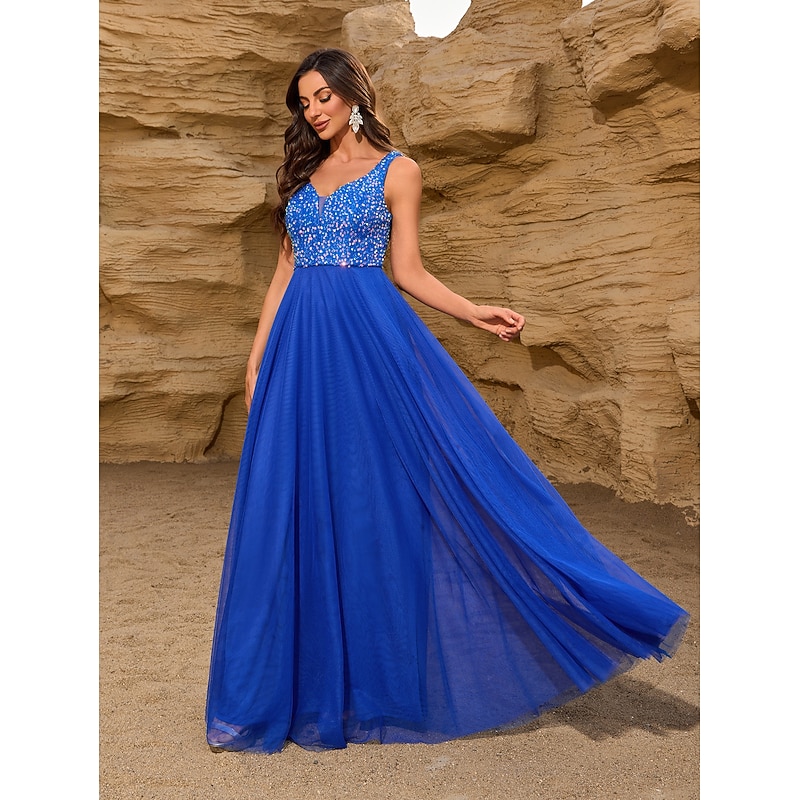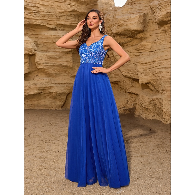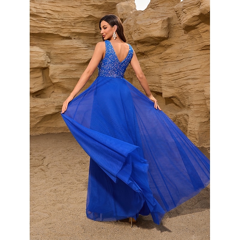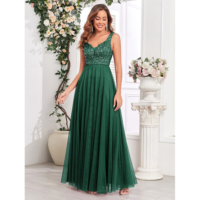 Featuring a sophisticated V-neckline and a chic V-back, this sleeveless dress combines modern allure with timeless elegance. The sequin embellishments on the bodice add a touch of sparkle, ensuring you stand out at any event.