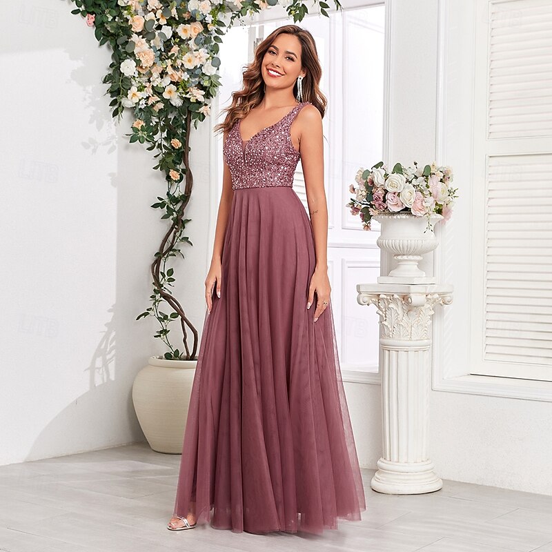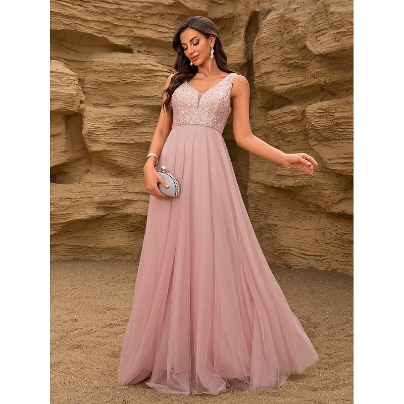 More information about A-Line Wedding Guest Dresses Elegant Dress Wedding Guest Birthday Floor Length Sleeveless V Neck Pink Dress Tulle V Back with Sequin