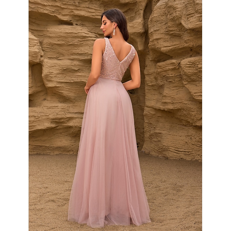 A-Line Wedding Guest Dresses Elegant Dress Wedding Guest Birthday Floor Length Sleeveless V Neck Pink Dress Tulle V Back with Sequin
