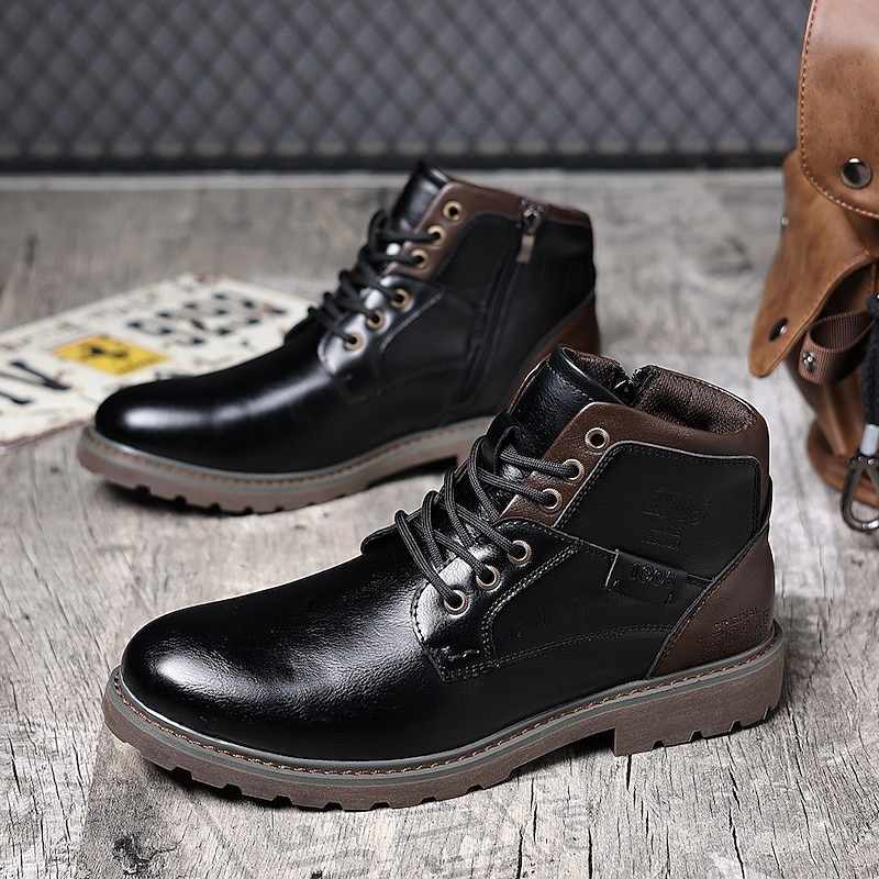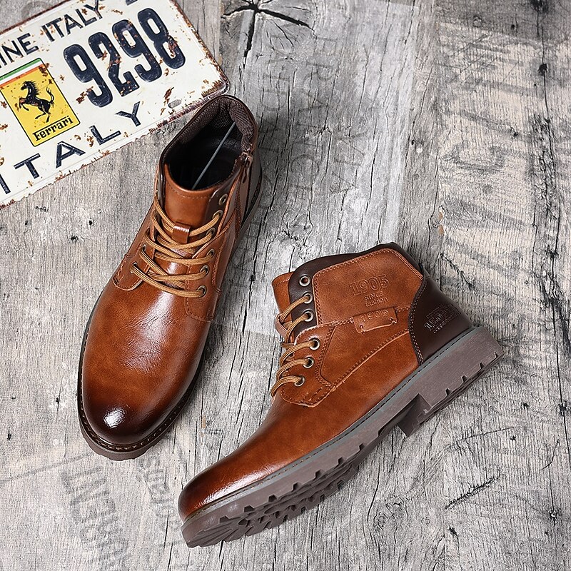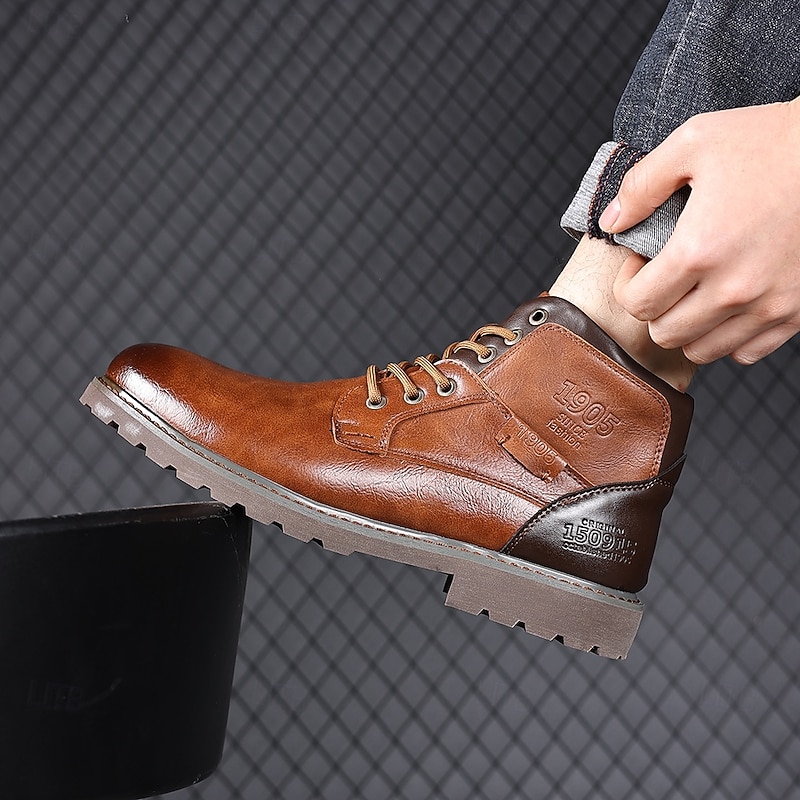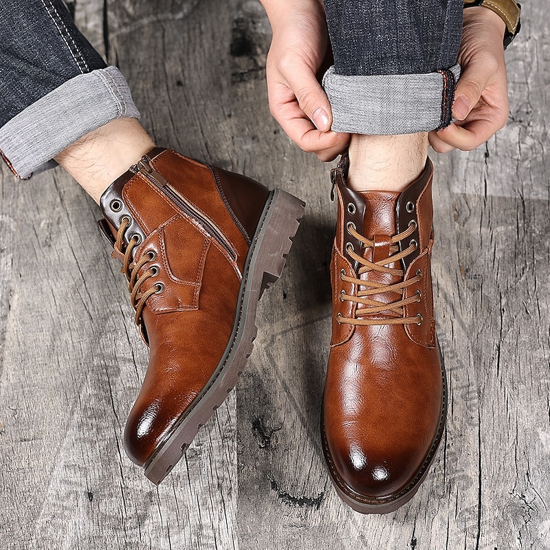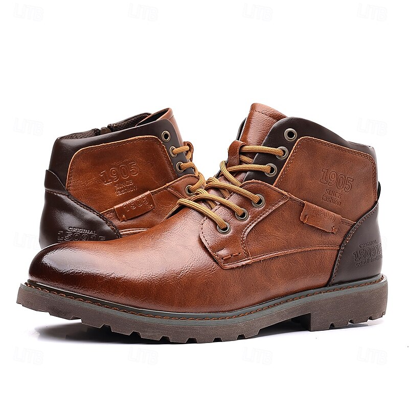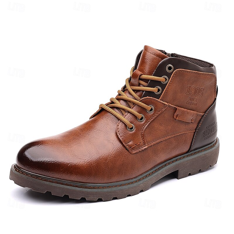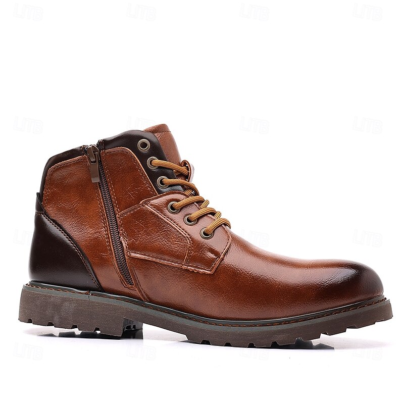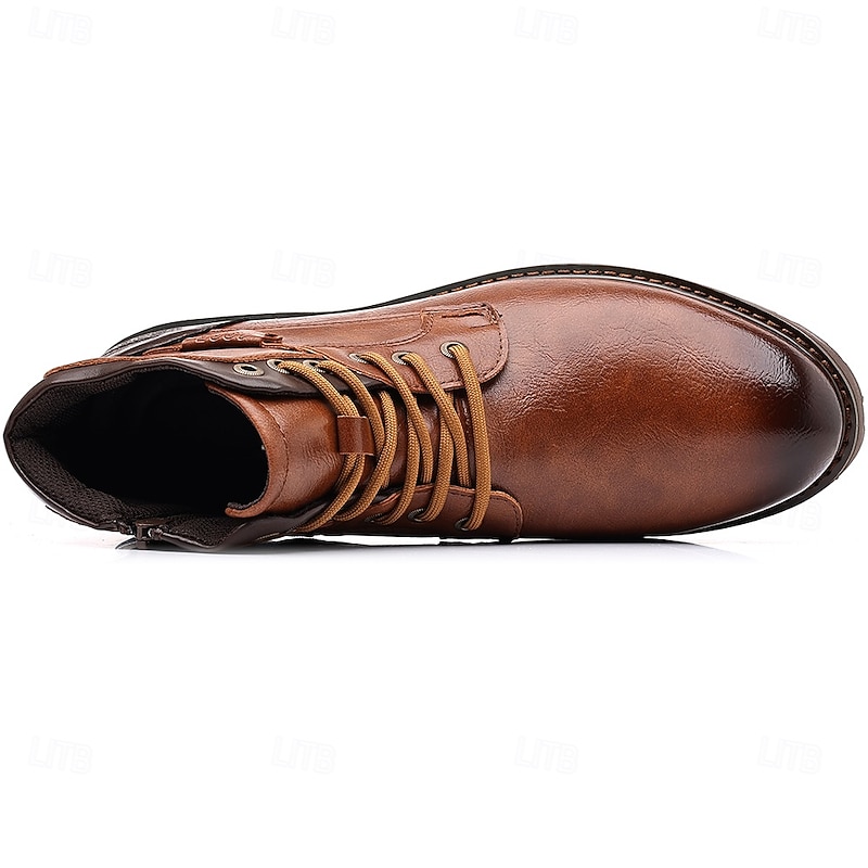 Highlights [Product Title] : Men's Vintage Brown Faux Leather Ankle Boots – Classic Lace-Up Design with Rugged Sole for Work & Casual Wear [Fabric] : Crafted from high-quality PU leather, these men's ankle boots are designed to offer both durability and a classic aesthetic. The material provides a sophisticated look that is versatile for a range of settings. [Fit] : Designed with a classic lace-up closure, these boots ensure a secure fit. The round toe shape and detailed stitching add to the timeless appeal, emphasizing both comfort and style. [Design Highlights] : Featuring a rugged sole and metal eyelets, these boots offer excellent grip and stability on various surfaces. The intricate stitching reflects craftsmanship, while the rich brown color adds a vintage touch to the overall design. [Occasions] : Perfect for outdoor adventures, work environments, and casual outings. These boots combine both functionality and fashion, making them a suitable choice for any occasion that requires a sturdy yet stylish footwear option. [Size Information] : Available in a variety of sizes ranging from US7.5 to US12, these boots cater to a wide range of foot sizes, ensuring a comfortable fit for everyone. The durable rubber outsole enhances slip resistance, ensuring reliable wear throughout the seasons.