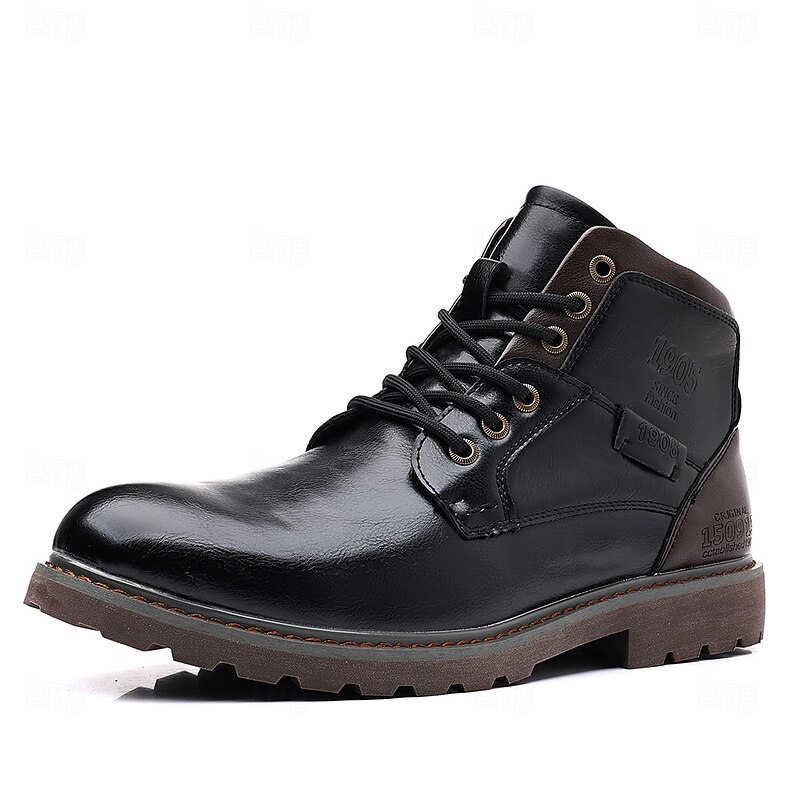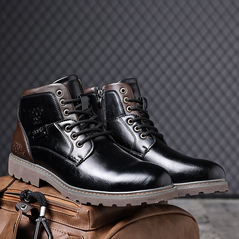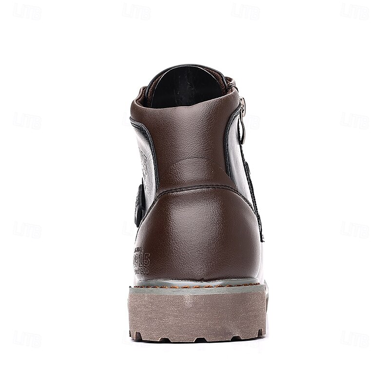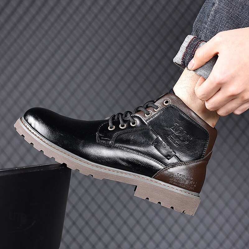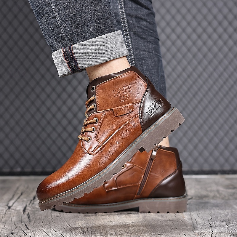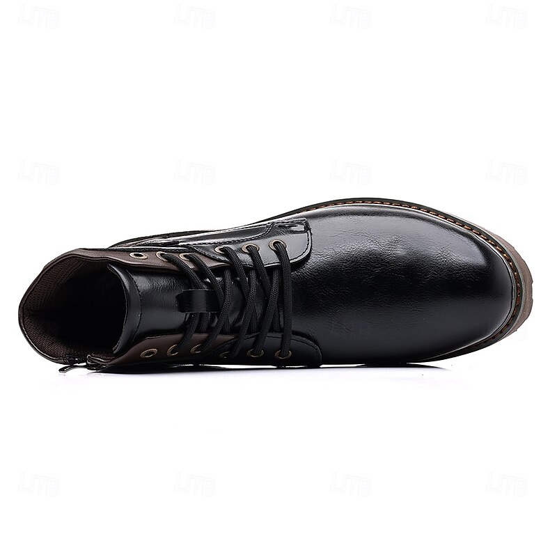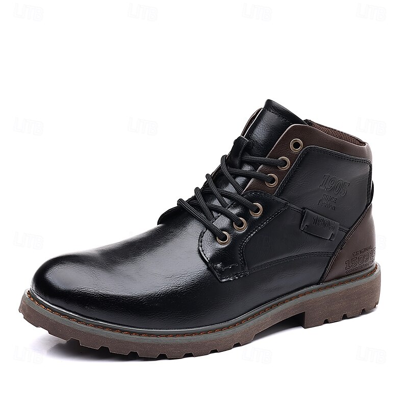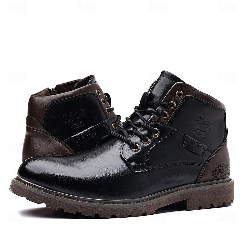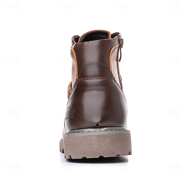 Highlights [Product Title] : Men's Vintage Brown Faux Leather Ankle Boots – Classic Lace-Up Design with Rugged Sole for Work & Casual Wear [Fabric] : Crafted from high-quality PU leather, these men's ankle boots are designed to offer both durability and a classic aesthetic. The material provides a sophisticated look that is versatile for a range of settings. [Fit] : Designed with a classic lace-up closure, these boots ensure a secure fit. The round toe shape and detailed stitching add to the timeless appeal, emphasizing both comfort and style. [Design Highlights] : Featuring a rugged sole and metal eyelets, these boots offer excellent grip and stability on various surfaces. The intricate stitching reflects craftsmanship, while the rich brown color adds a vintage touch to the overall design. [Occasions] : Perfect for outdoor adventures, work environments, and casual outings. These boots combine both functionality and fashion, making them a suitable choice for any occasion that requires a sturdy yet stylish footwear option. [Size Information] : Available in a variety of sizes ranging from US7.5 to US12, these boots cater to a wide range of foot sizes, ensuring a comfortable fit for everyone. The durable rubber outsole enhances slip resistance, ensuring reliable wear throughout the seasons.