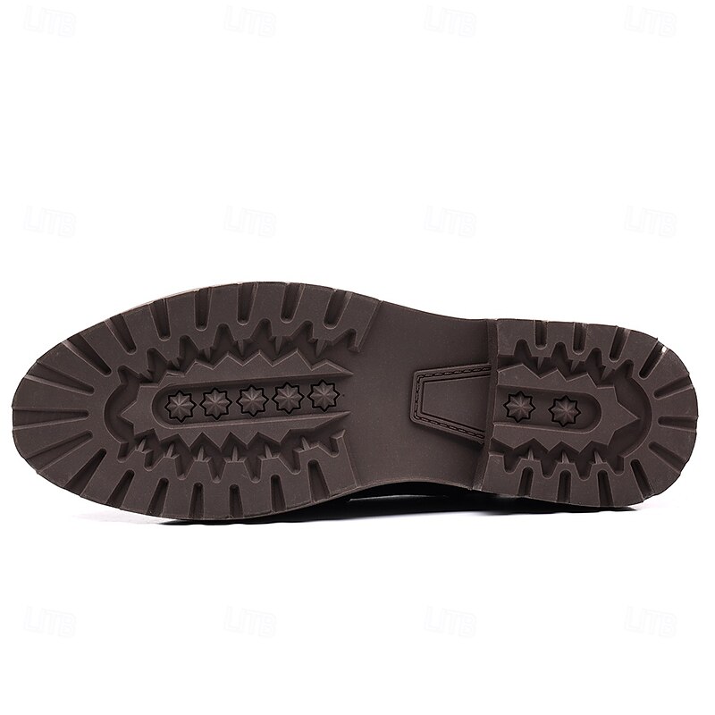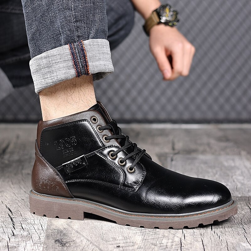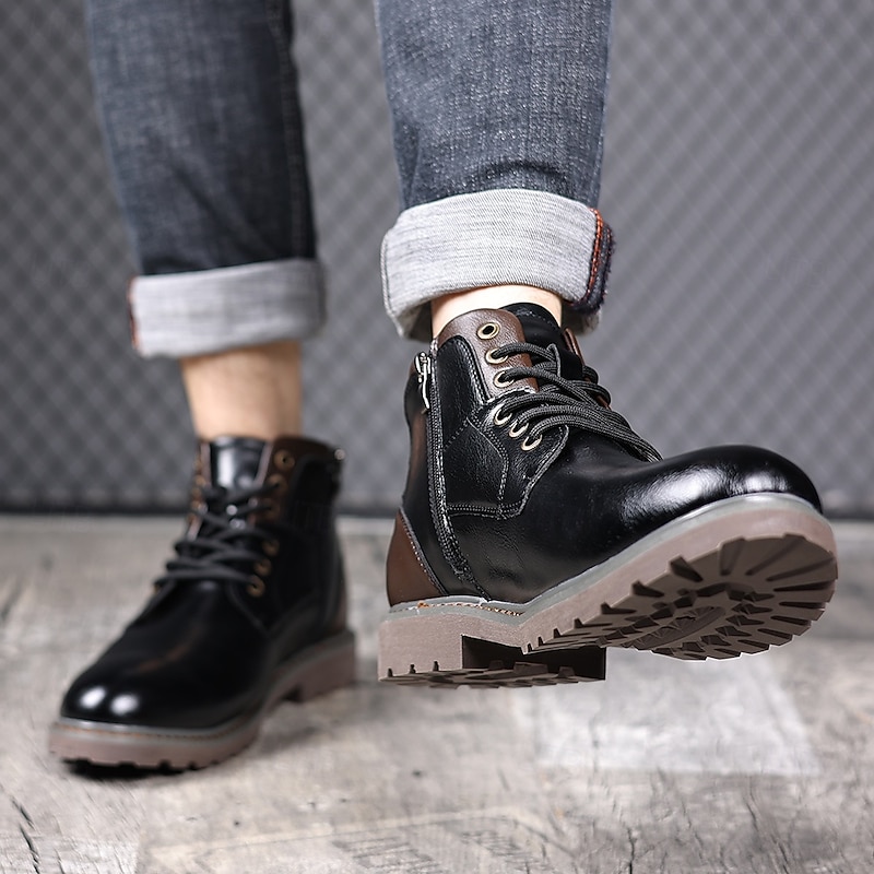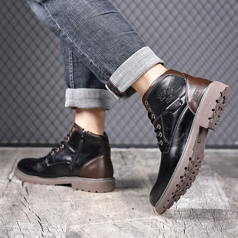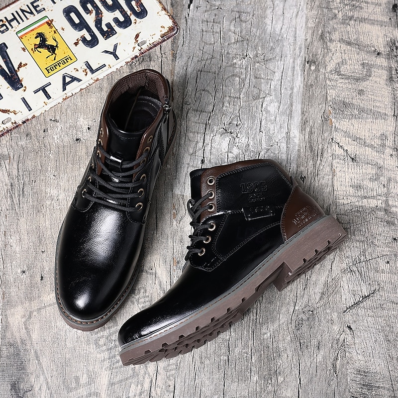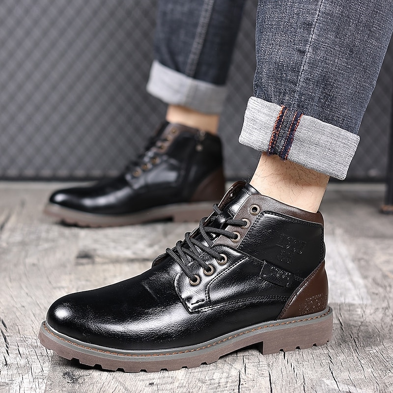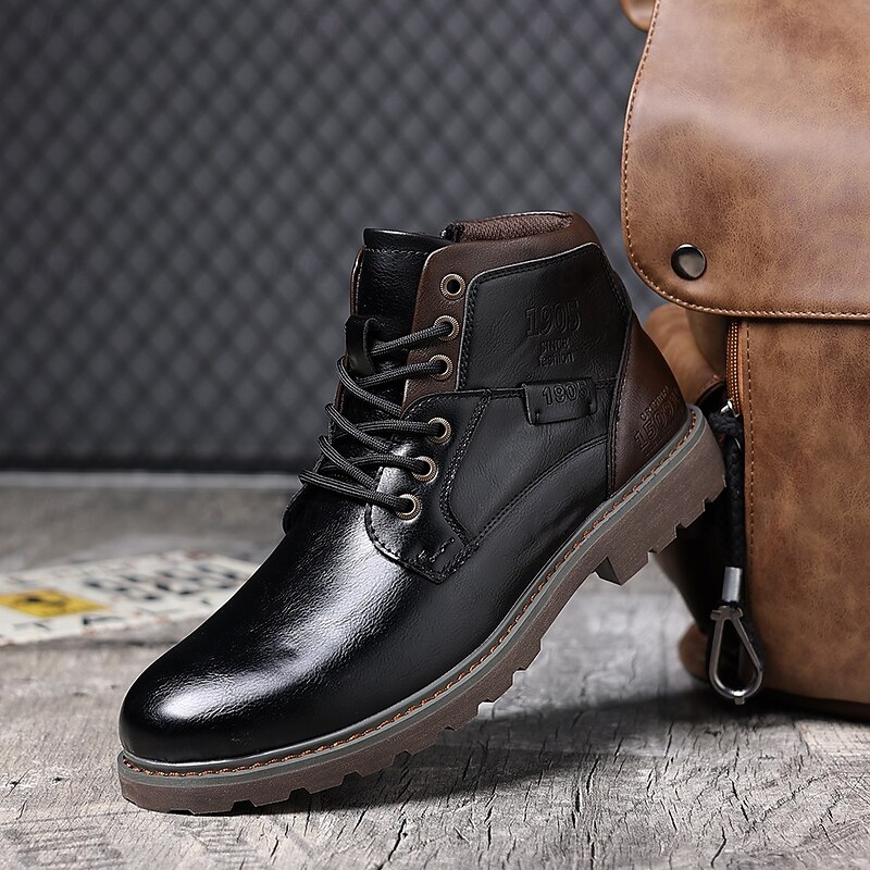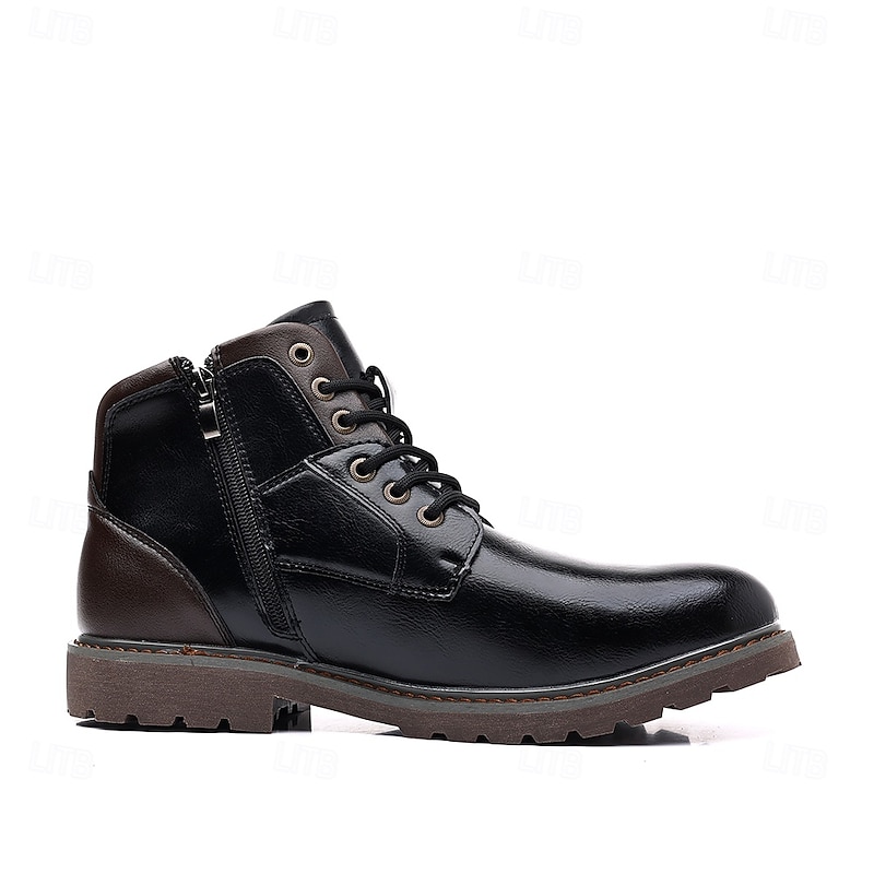 Highlights [Product Title] : Men's Vintage Brown Faux Leather Ankle Boots – Classic Lace-Up Design with Rugged Sole for Work & Casual Wear [Fabric] : Crafted from high-quality PU leather, these men's ankle boots are designed to offer both durability and a classic aesthetic. The material provides a sophisticated look that is versatile for a range of settings. [Fit] : Designed with a classic lace-up closure, these boots ensure a secure fit. The round toe shape and detailed stitching add to the timeless appeal, emphasizing both comfort and style. [Design Highlights] : Featuring a rugged sole and metal eyelets, these boots offer excellent grip and stability on various surfaces. The intricate stitching reflects craftsmanship, while the rich brown color adds a vintage touch to the overall design. [Occasions] : Perfect for outdoor adventures, work environments, and casual outings. These boots combine both functionality and fashion, making them a suitable choice for any occasion that requires a sturdy yet stylish footwear option. [Size Information] : Available in a variety of sizes ranging from US7.5 to US12, these boots cater to a wide range of foot sizes, ensuring a comfortable fit for everyone. The durable rubber outsole enhances slip resistance, ensuring reliable wear throughout the seasons.