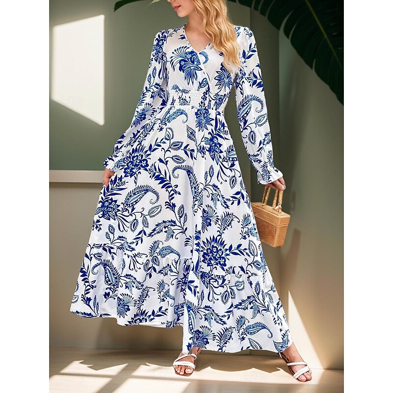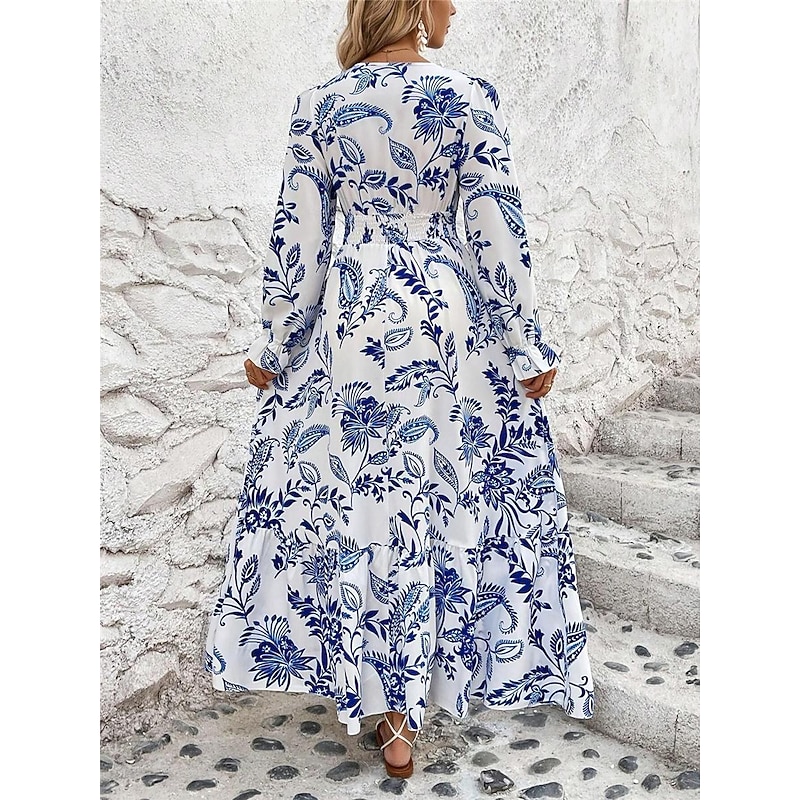 Highlights [Fabric] : Crafted from high-quality polyester, this dress is lightweight and breathable, making it an ideal choice for fall weather. The micro-elastic fabric ensures a comfortable fit while maintaining its elegant shape. [Silhouette] : The dress features a flattering A-line fit that complements a variety of body types. The waist is gently fitted to enhance the natural curves, creating a graceful and flowing silhouette that extends to a maxi length. [Design Highlights] : This elegant long dress showcases a beautiful floral print in shades of blue on a classic white background. It features a sophisticated V-neckline and long sleeves with subtle puff details at the shoulders, adding a touch of femininity. The addition of ruffle accents further enhances its stylish and refined appearance. [Occasions] : Perfect for a range of occasions, from casual daily outings to more formal events. Whether attending a family gathering or a day out with friends, this dress brings a sense of style and elegance suitable for diverse social settings. [Size Range] : Available in a variety of sizes, including S, M, L, XL, 2XL, and 3XL, this dress is designed to offer a great fit for different figures, ensuring you find a size that suits you perfectly.