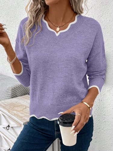 • Feature: scallop trim, ruffle hem, drop shoulder, solid color, v neck, ribbed knit, long sleeve trendy casual sweaters