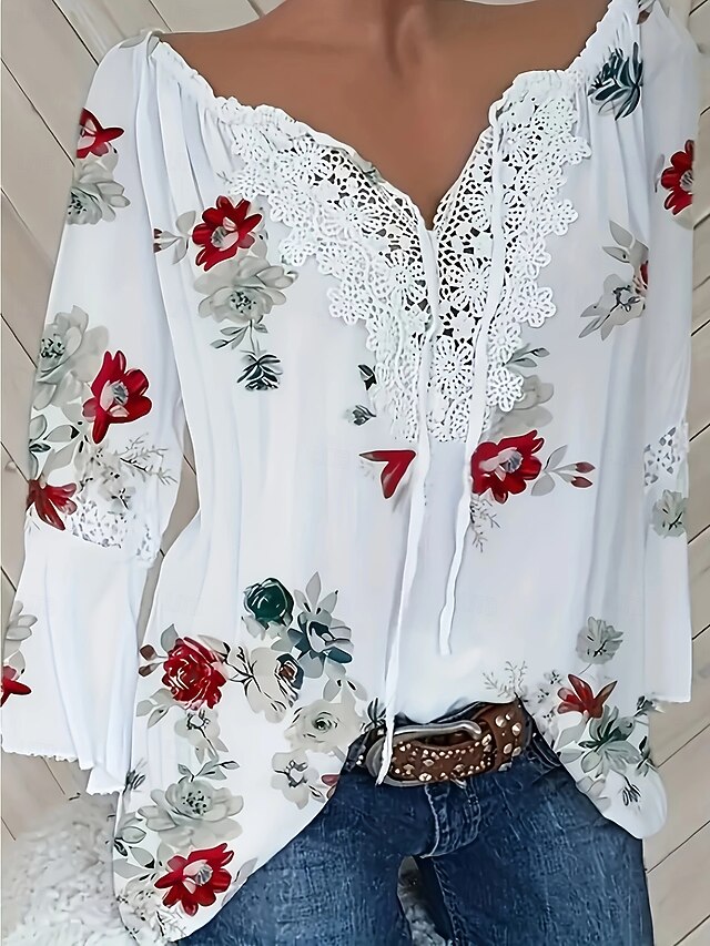 Women's Summer Tops Flower Modern Long Sleeve V Neck Regular Tops White Summer 1