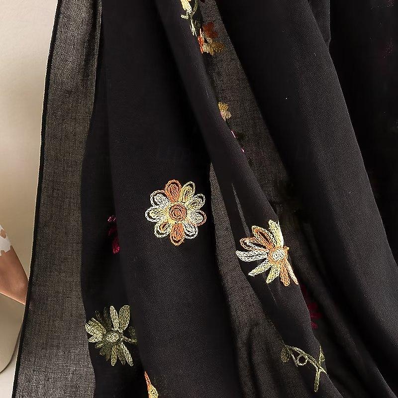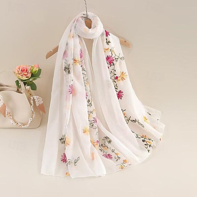 Highlights [Fabric]: Crafted from lightweight chiffon, this women's scarf combines the softness of cotton and linen, creating an airy feel that is perfect for warmer seasons like spring and summer. The breathable material ensures comfort throughout the day. [Style]: With its rectangular shape and retro flair, this scarf drapes elegantly, making it a versatile accessory for both casual and formal occasions. Its wide design allows for various styling options, from a chic wrap to a stylish layered look. [Design Highlights]: This scarf features exquisite floral embroidery in vibrant colors that add a feminine and charming touch. The intricate flower patterns enhance its visual appeal, making it an ideal statement piece for any outfit. [Occasions]: Perfect for dates, daily errands, street outings, or weekend getaways, this scarf adds a fashionable accent to any ensemble. Its lightweight nature also makes it a great choice for spring and summer events, providing both style and subtle warmth. [Size]: Available in a one-size-fits-all design, this scarf offers versatility, allowing it to be styled in multiple ways to suit different preferences and outfit choices.