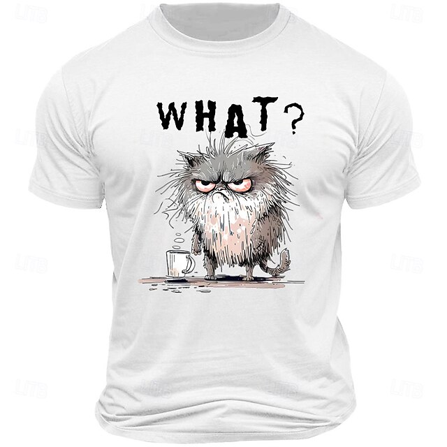 Mens T-shirt, Funny Grumpy Cat 'WHAT?' Morning Coffee Short Sleeve Graphic Tee 7