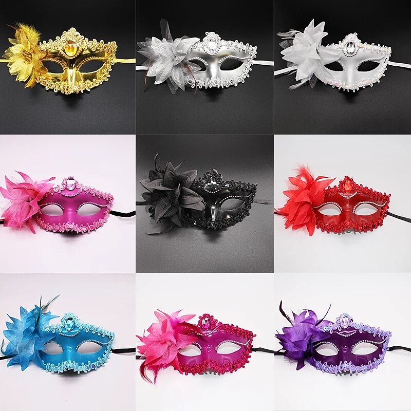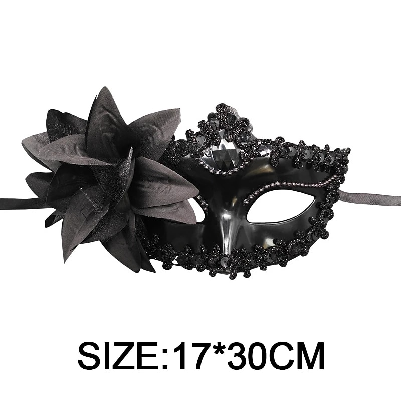 Highlights [Product Fabric] Crafted from soft plastic and mesh, these masquerade masks provide durability while being lightweight, ensuring all-night comfort without compromising luxuriousness. [Design and Shape] These masks are sculpted with meticulous detail, featuring a classic Venetian silhouette that beautifully contours the face. Intricate lace embellishments highlight the eye cutouts and borders, bringing an elegant and timeless appeal suitable for any special occasion. [Design Highlights] Each mask is adorned with sparkling sequins and a prominent large gemstone at the center, elevating its opulent charm. The addition of a matching fabric flower and feather embellishment on one side enhances its dramatic and festive allure. [Occasions] Perfectly suited for masquerade balls, costume parties, and theatrical performances. These masks add a romantic and mysterious touch, ideal for date nights, birthday parties, or seasonal festivals. Available in a variety of vibrant colors such as gold, pink, red, blue, and purple, they complement a wide range of festive themes. [Size Notice] The masks feature a stretchy elastic band for a secure and adjustable fit, making them suitable for all head sizes. This ensures comfort and versatility, allowing you to enjoy your event without any fitting concerns.
