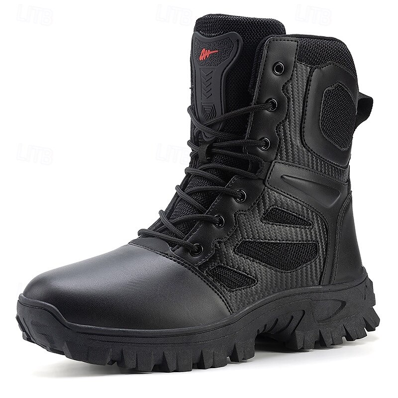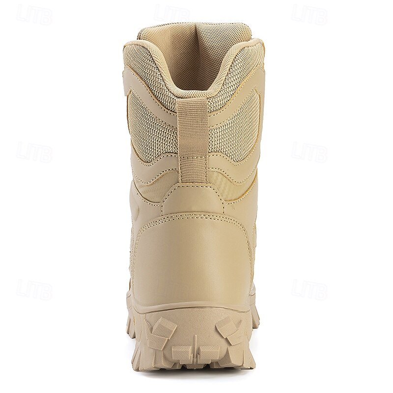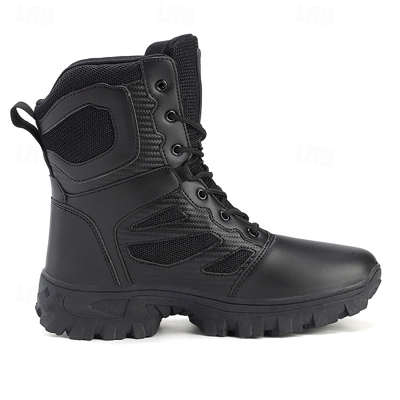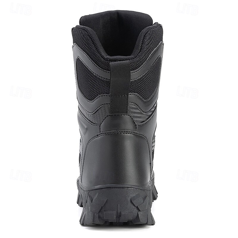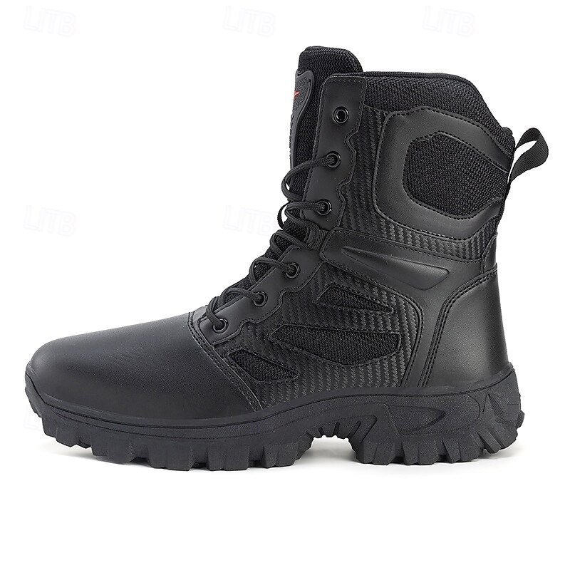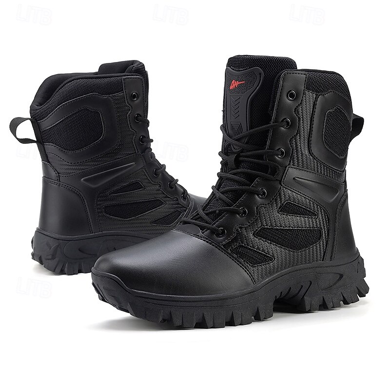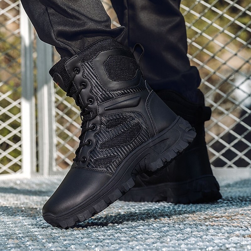 Highlights [Fabric and Construction] : These men's lightweight tactical boots are crafted from durable PU leather and nylon, featuring a breathable mesh lining that ensures comfort and ventilation during extended wear. The combination of tough materials provides robustness without compromising on comfort, making them ideal for various demanding situations. [Fit and Design] : Designed with a round toe and high ankle support, these boots ensure a secure fit and excellent protection. The lace-up closure allows for an adjustable and snug fitting, while the padded tongue and collar provide enhanced comfort and reduce pressure on the feet during long wear periods. [Design Highlights] : The tactical boots showcase a rugged rubber outsole with deep treads, offering superior grip and slip resistance on diverse terrains. This practical design feature ensures stability and safety, making them suitable for challenging environments. Their lightweight construction allows for ease of movement, perfect for both tactical operations and everyday tasks. [Occasions] : These versatile boots are perfect for hiking, work, military operations, and outdoor adventures. Whether navigating tough terrains or engaging in tactical missions, they are built to withstand various conditions and provide reliable performance. [Size Range] : Available in a wide range of sizes to accommodate different foot measurements, these boots are offered in sizes ranging from US7 to US11. This inclusive sizing ensures a suitable fit for a majority of men seeking durable and functional footwear.