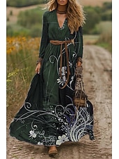 More information about Women's Maxi Dress A Line Dress Pleated Dress Fit And Flare Dress Vacation Casual Boho Date Going out Regular Fit Floral Graphic Long Sleeve V Neck Purple Brown Green Spring Fall Winter Autumn