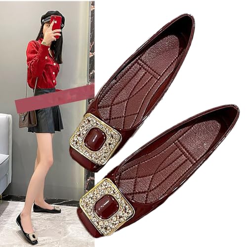 HOT ! Womens Patent Leather Comfort Square Toe Ballets Flats Closed Toe Rhinestone Slip On Dress Shoes for Wedding Driving Dating Classical Walking Shoes