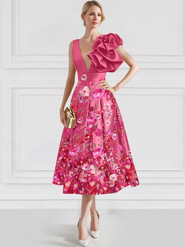 Floral A-Line Cocktail Dresses Elegant Dress Formal Wedding Ankle Length Sleeveless V Neck Satin with Embroidery Pocket 1