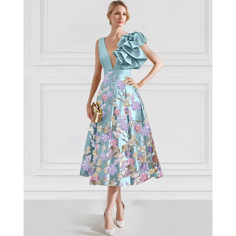 More information about Floral A-Line Cocktail Dresses Elegant Dress Formal Wedding Ankle Length Sleeveless V Neck Satin with Embroidery Pocket