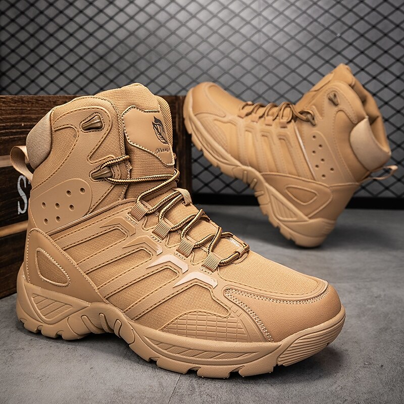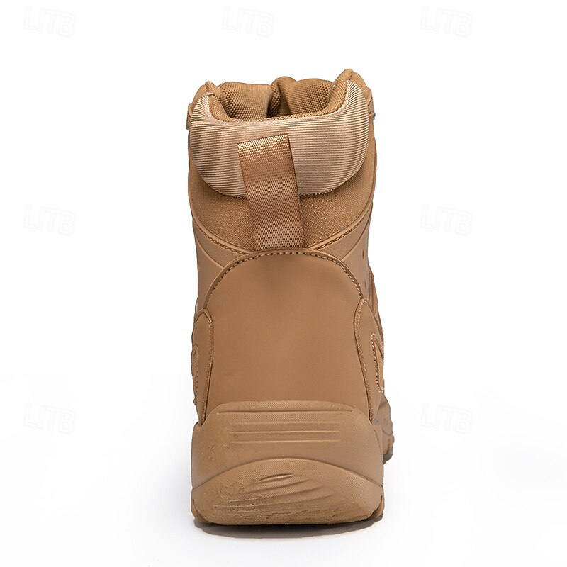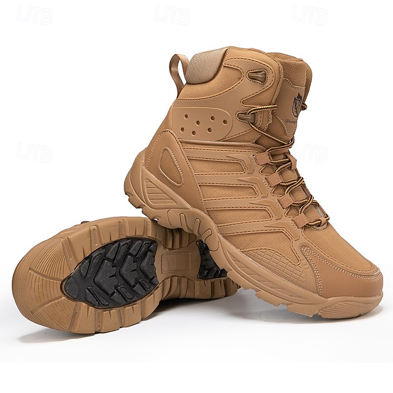 The boots feature reinforced toe caps for added safety and support, essential for challenging outdoor conditions. A non-slip rubber outsole ensures a solid grip on various surfaces, enhancing your stability during hikes and treks. The tan hue adds a versatile touch, complementing a range of outdoor gear, while the texture and design reflect a robust, tactical aesthetic.