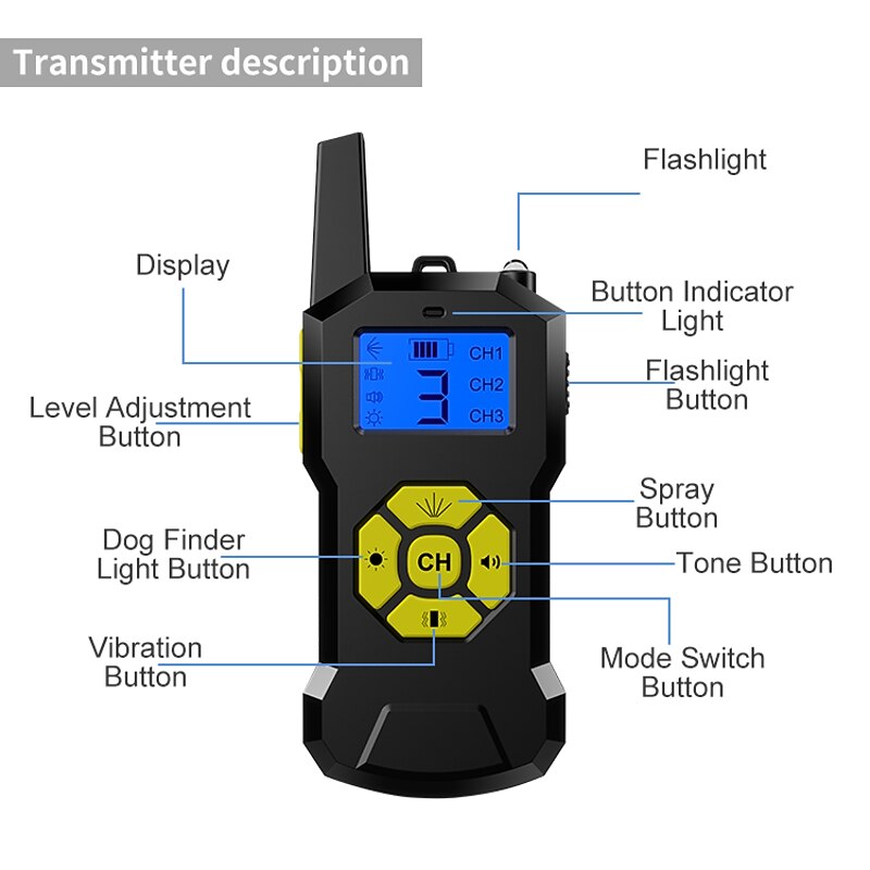 Highlights Safe and harmless The spray used is natural essential oil, which doesn’t contain CFC, environmentally and harmless pet corrector spray for dogs. No pain for dogs, effectively keeping them calm and safe throughout training.(NOTE: THIS BARK COLLAR DOESN'T INCLUDE CITRONELLA SPRAY, PLEASE PURCHASE IT LOCALLY ). Upgraded Spray Mode Compared with other dog collars which has only one spray, our product spray mode can offer 3 consecutive sprays, more effective for stopping dogs barking or for training. Effective Training Effectively stop unwanted dog barking by harmless spray, and correct their misbehavior like running wildly, biting furniture, disobey orders, etc by Sound/Vibration/Light modes. You can select the most proper way to train your dogs. Fit for Most Dogs The adjustable strap makes this bark collar fits from small to large dogs. Pls make sure to adjust the dog collars to proper length. *Please note that your dogs should be over 6 months and able to recognize basic commands like “sit” or “stay” before using the training collar. Rechargeable & Waterproof The electric dog collars come with environmentally built-in rechargeable lithium battery, 1-2 hours full charge for 7-12 days of regular use. IPX5 waterproof design allows dogs to enjoy fun in splash water or light rain, but please take the dog collars off when dogs goes bathing or swimming. Tips: The dog training kit does not contain spray and needs to be purchased separately. If you have any questions about the use, please feel free to contact us.