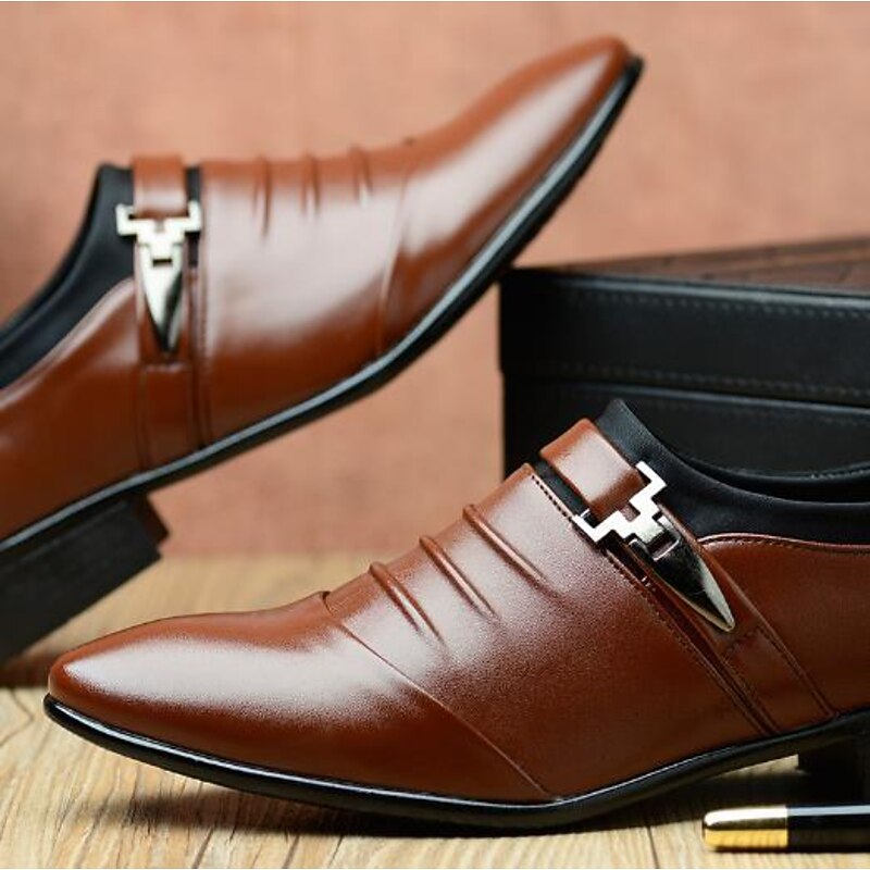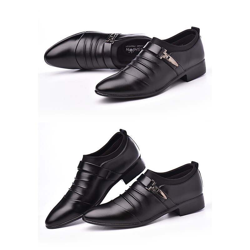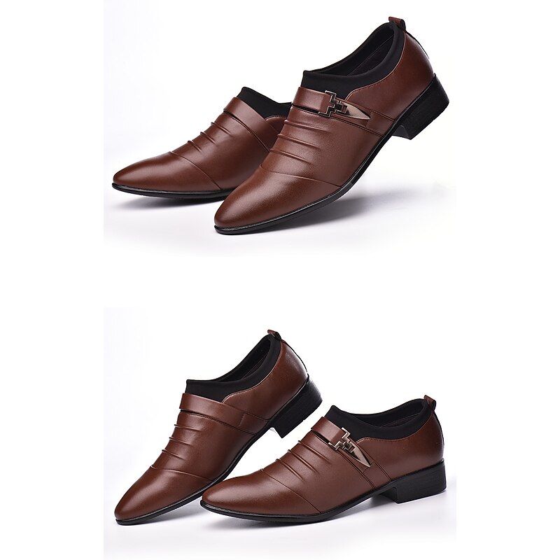 Highlights [Fabric] : Crafted from high-quality PU, these men's loafers offer a breathable and durable construction, ensuring wear-proof comfort perfect for daily and office environments. [Fit] : Designed as a sleek business style with a pointed toe shape, these loafers provide both elegance and a professional look, ideal for complementing formal attire. [Design Highlights] : Featuring a sophisticated metal buckle on the upper and a color block pattern, these loafers add a modern and refined accent. The durable rubber outsole ensures non-slip stability, and the minimalist design offers understated style. [Occasions] : Suitable for a range of occasions including office, career, and daily activities, these loafers are perfect for walking, business meetings, or any formal setting where style and comfort are paramount. [Size Range] : Available in a variety of sizes, from US6 to US12, these loafers accommodate diverse fitting needs and ensure a comfortable fit for different foot sizes.