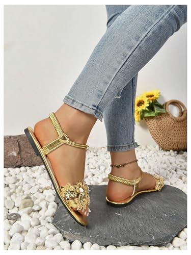 GORGLITTER Women's 3D Flower Vacation Flat Sandals Metallic Ankle Strap Open Toe Dressy Sandals 5