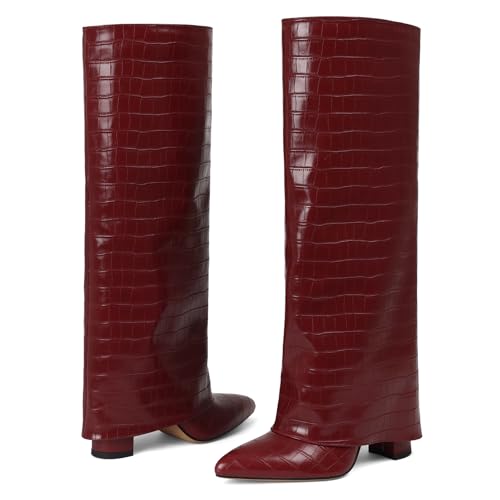 More information about Lyrisiphy Knee High Slouchy Boots Women Fold Over Chunky High Heeled Wide Calf Boots Pointed Toe Shark Casual Tall Boots with Half Side Zipper