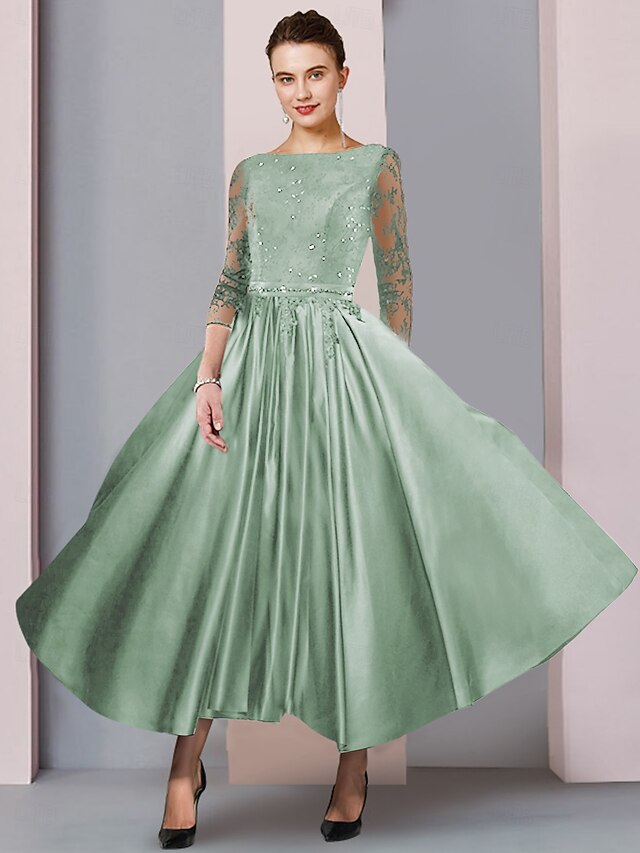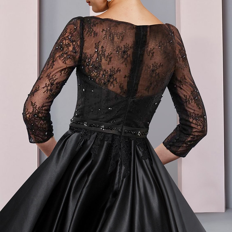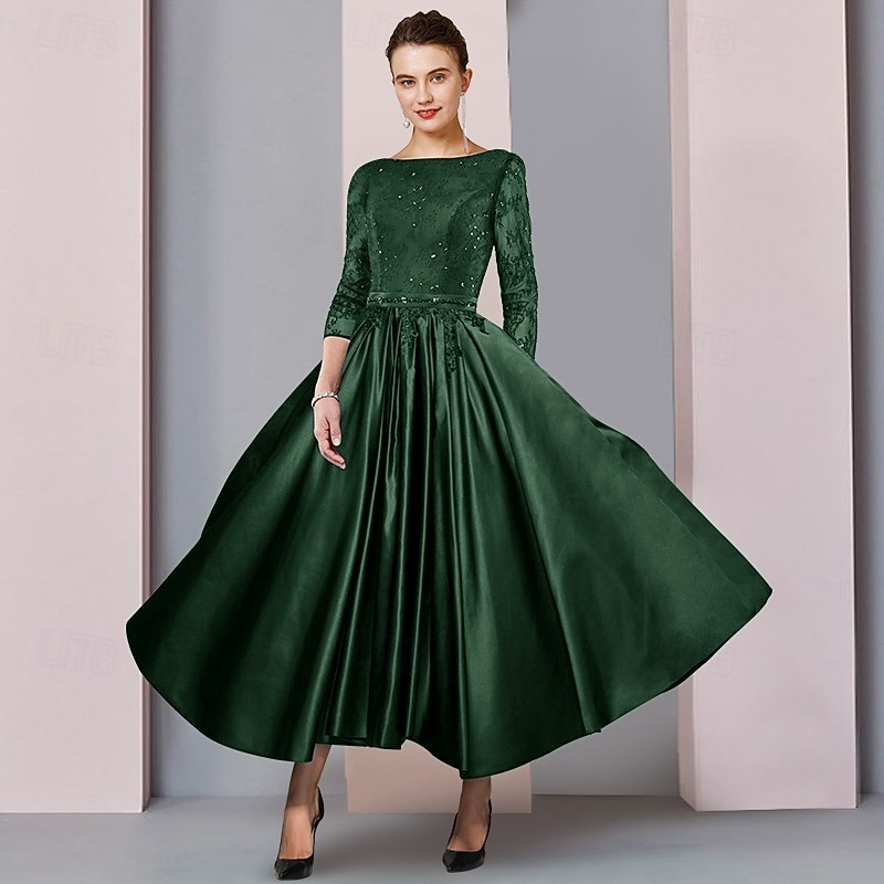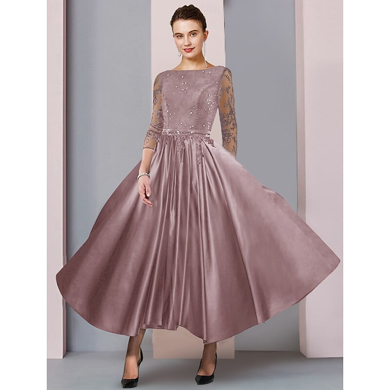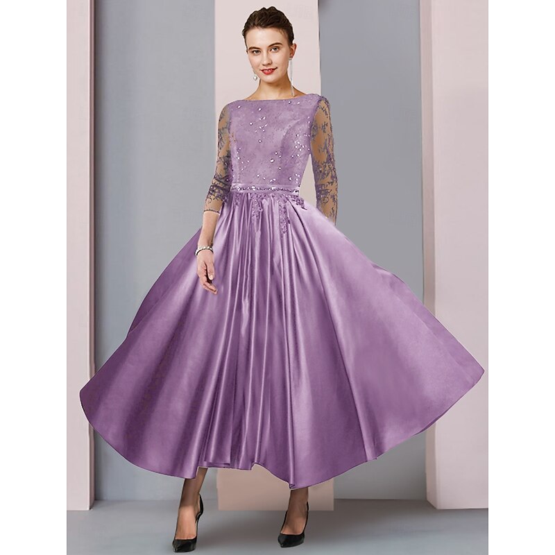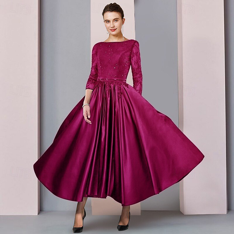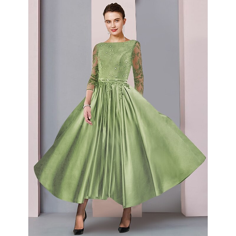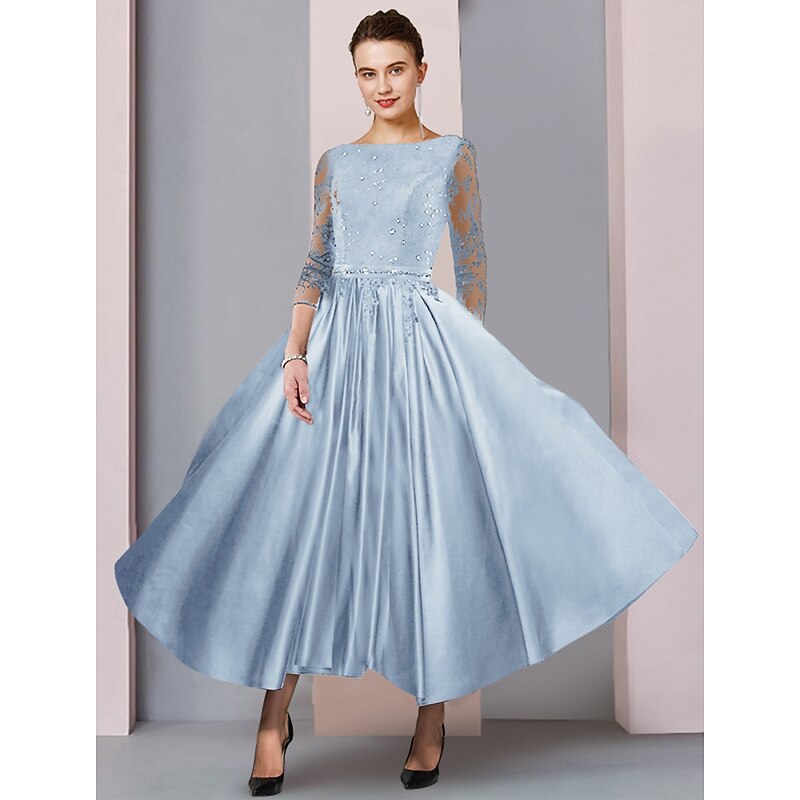 More information about A-Line Mother of the Bride Dress Formal Wedding Guest Elegant Party Scoop Neck Tea Length Satin Lace 3/4 Length Sleeve with Sash / Ribbon Pleats