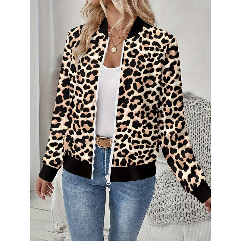 Women's Jacket Comfortable Print Outdoor Casual Boho Vintage Geometric Vacation Home Casual Daily Wear Short Baseball Collar Regular Fit Long Sleeve Outerwear Black And White Light Yellow Leopard 1