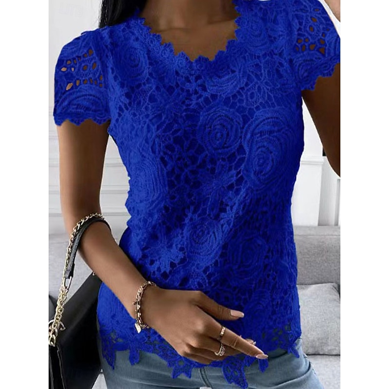 More information about Women's Blouse Solid Color Elegant Daily Stylish Short Sleeve V Neck Regular Tops Daily Holiday Going out Lace White Pink Wine Blue Summer Spring