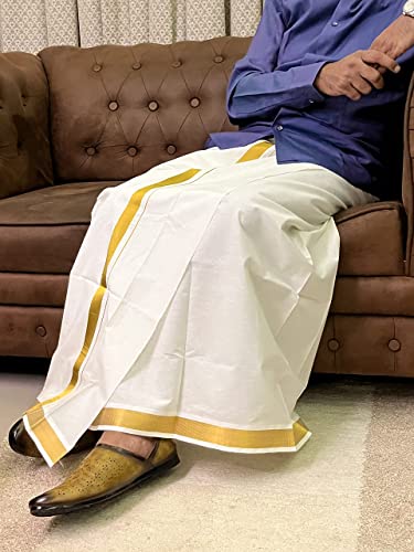 • Cream color single dhoti with golden zari border, suitable for: Festivals, Pongal, Wedding, Party