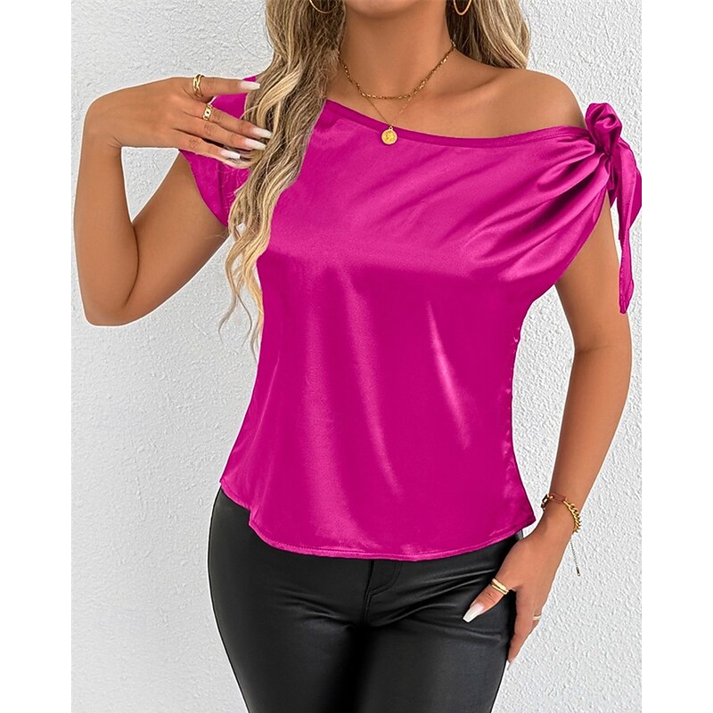 Women's Shirt Elegant Dressy Satin Solid Color Stylish Casual Short Sleeve Cold Shoulder Regular Tops Daily Going out Bow Black Pink Wine Purple Green Summer Spring 23