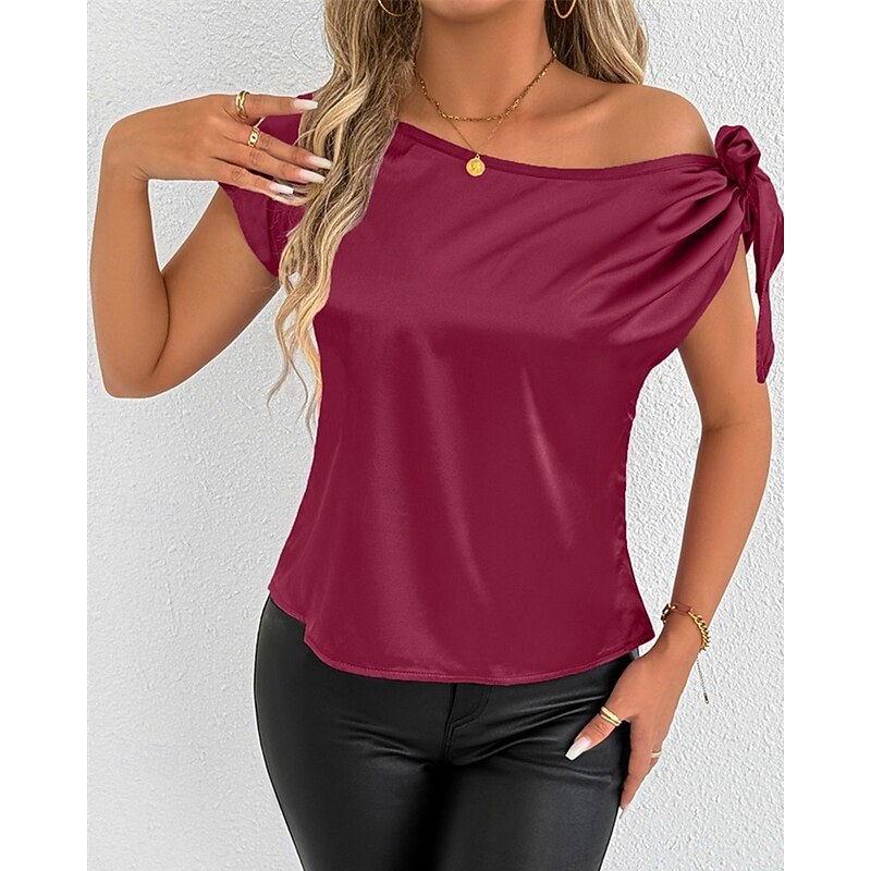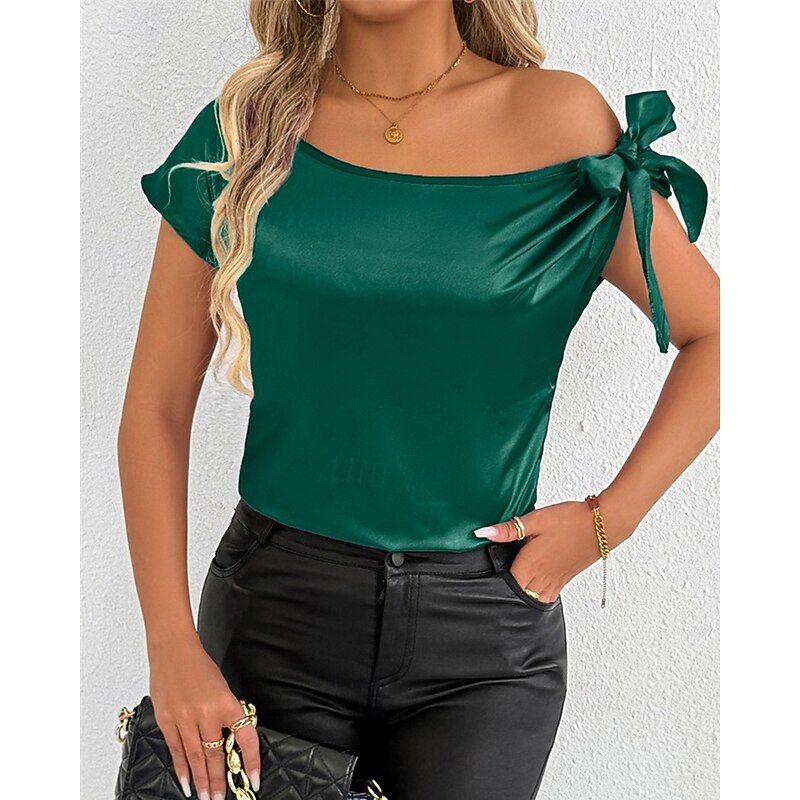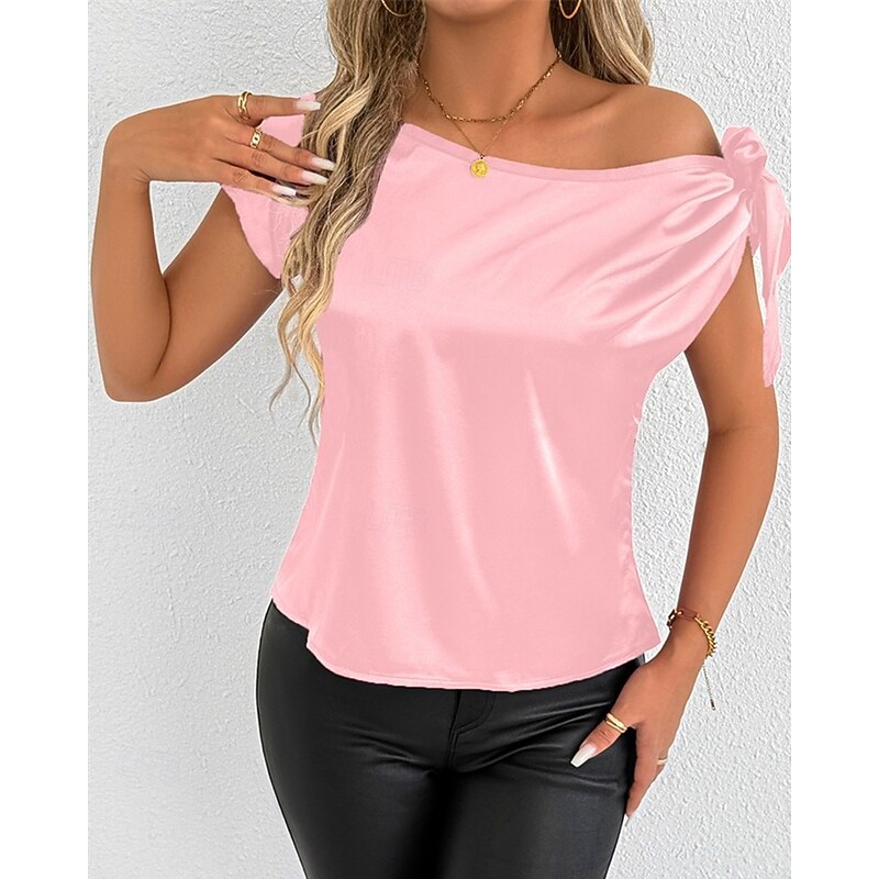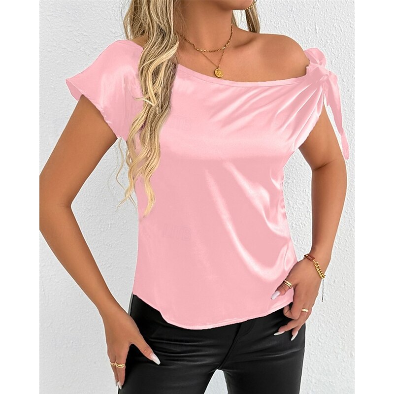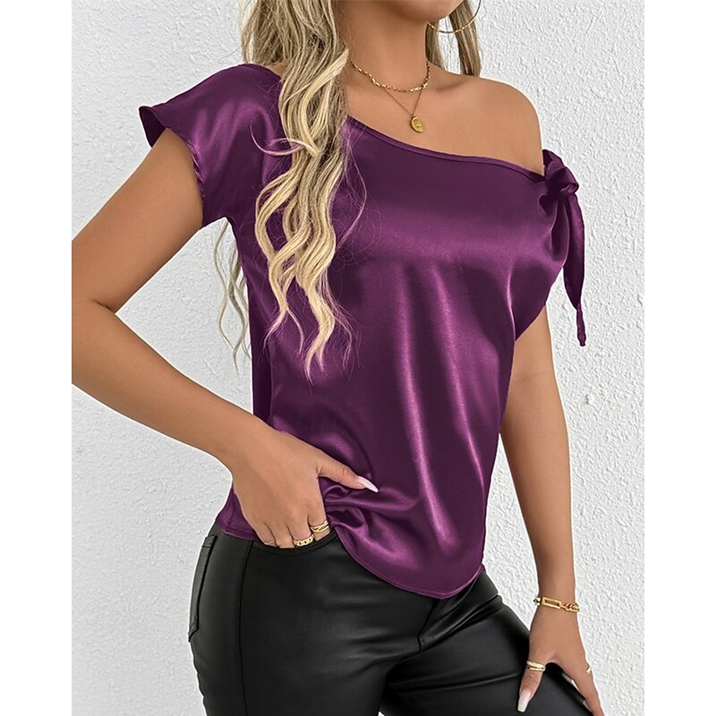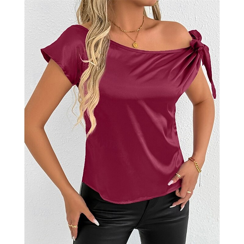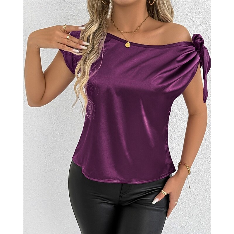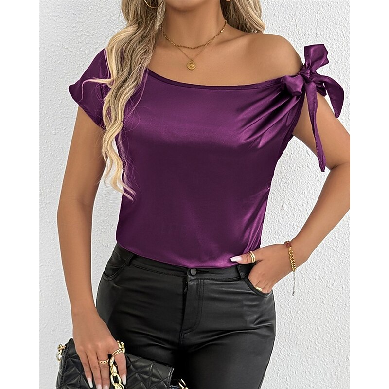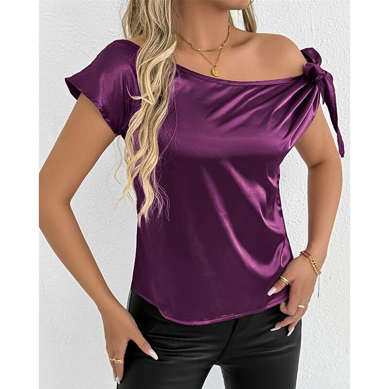More information about Women's Shirt Elegant Dressy Satin Solid Color Stylish Casual Short Sleeve Cold Shoulder Regular Tops Daily Going out Bow Black Pink Wine Purple Green Summer Spring