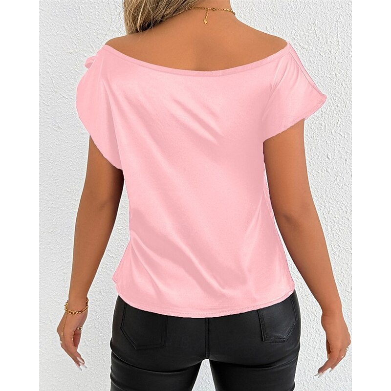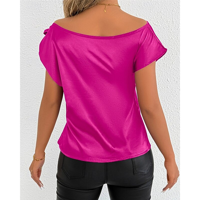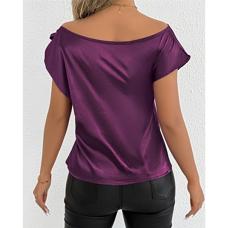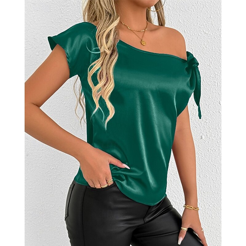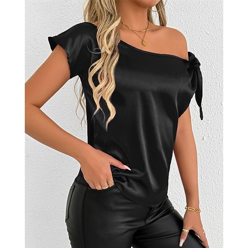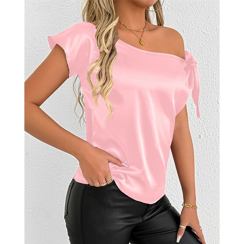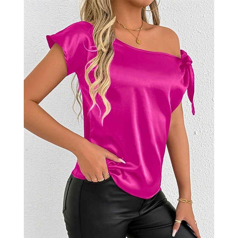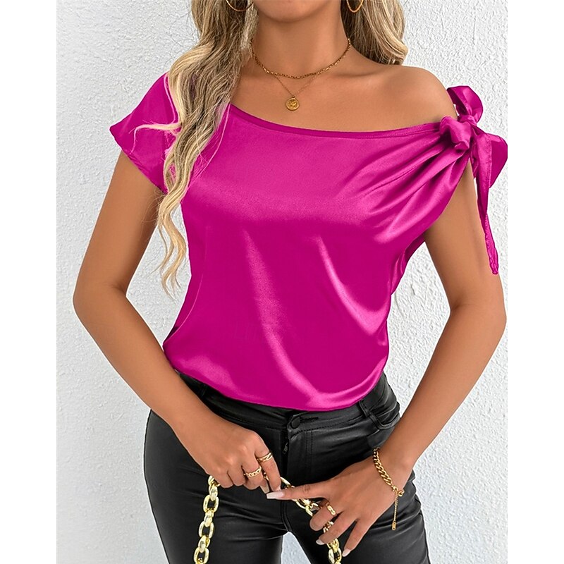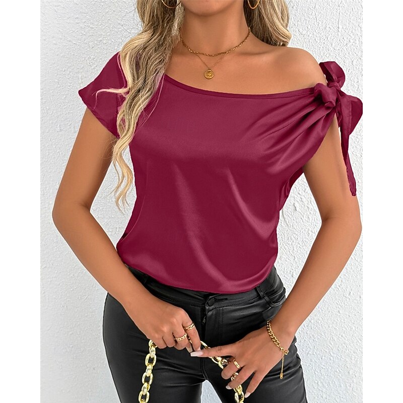 More information about Women's Shirt Elegant Dressy Satin Solid Color Stylish Casual Short Sleeve Cold Shoulder Regular Tops Daily Going out Bow Black Pink Wine Purple Green Summer Spring