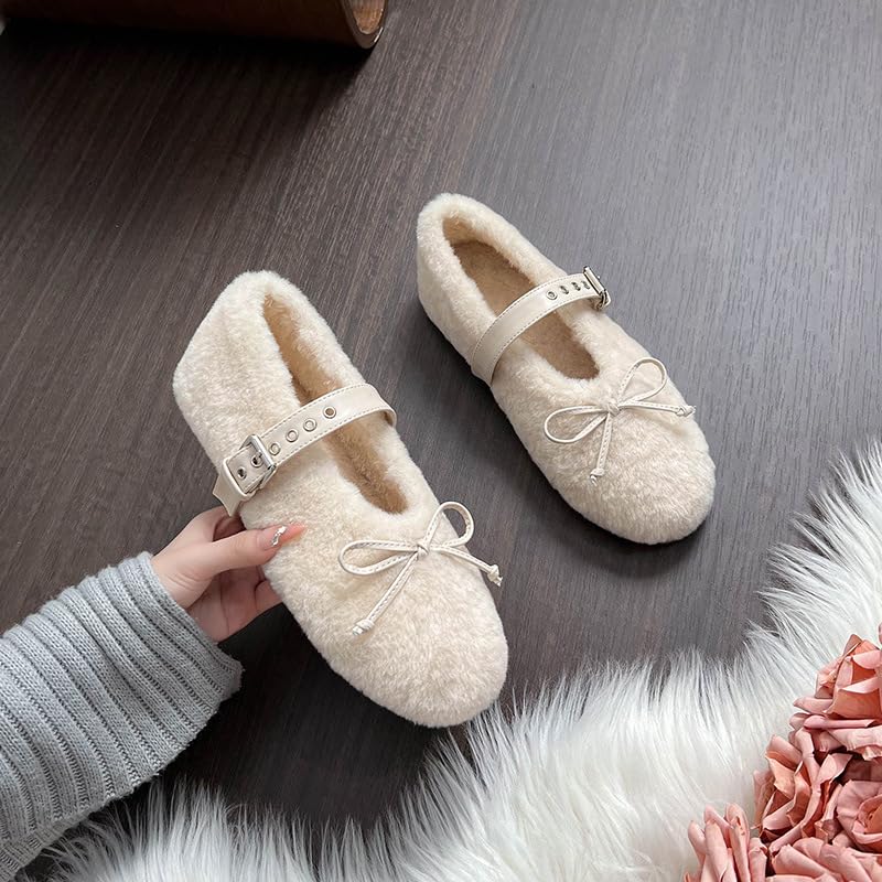 Fur Ballet Flats for Women Mary Jane Flats Buckle Strap Comfy Ballerina Flat Shoes Cute Casual Faux Fur Shoes 6