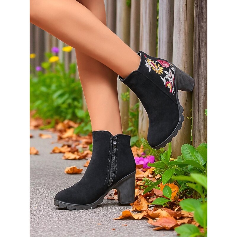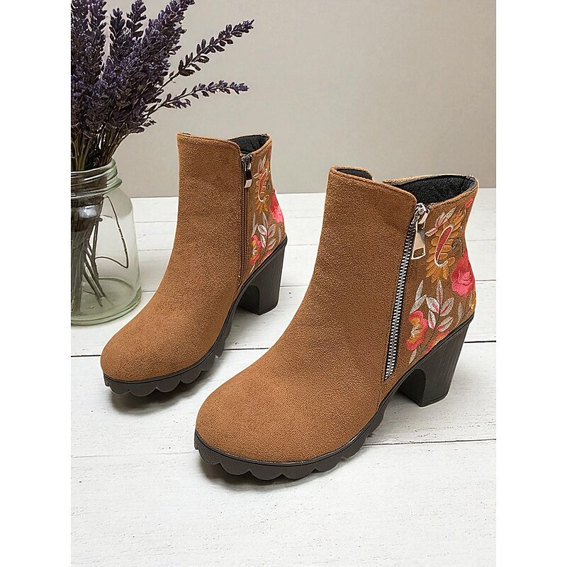 Women's Brown Floral Embroidered Ankle Boots with Zipper Closure, Chic and Comfortable, Perfect for Casual Outings, Fall Gatherings and Outdoor Activities 1