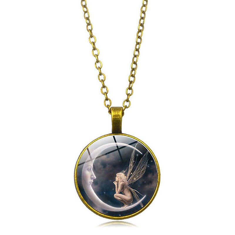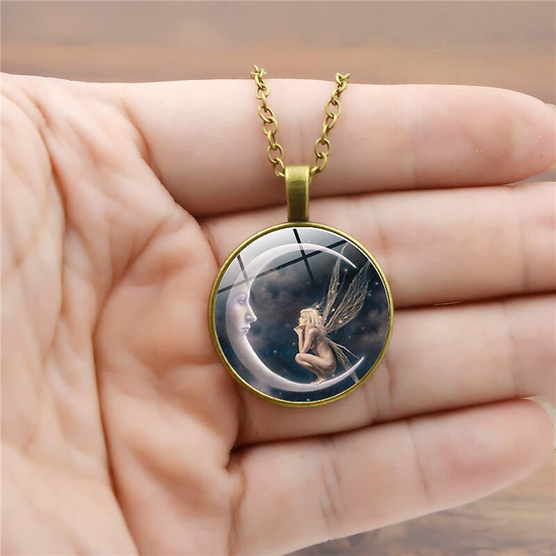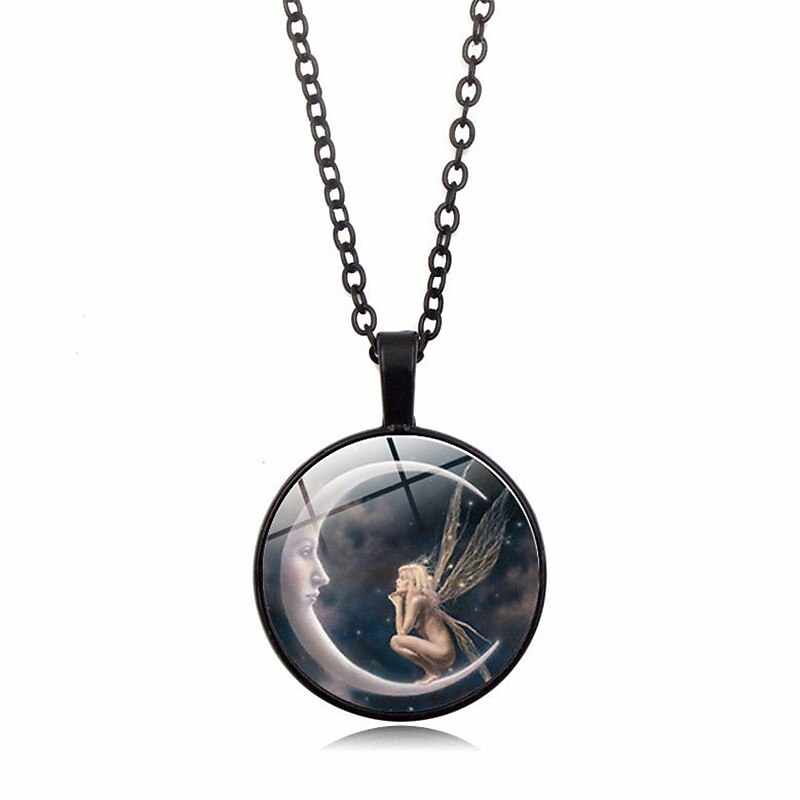 Highlights [Material:] Crafted from durable alloy, this necklace offers a glossy, polished finish that exudes elegance and sophistication, ensuring a lasting impression and a touch of luxury. [Design Highlights:] The pendant features a beautifully crafted fairy sitting on a crescent moon against a cosmic backdrop, with delicate wings and intricate artwork. The circular design embodies a mystical theme, while the matching metal chain enhances its artistic style, making it a unique accessory. [Style and Fit:] This one-size necklace serves as a charming statement piece or a whimsical touch to any ensemble, whether casual or formal. Its vintage and holiday style is perfect for fans of fantasy and celestial-themed jewelry. [Occasions:] Ideal for a variety of settings such as daily wear, street outings, holidays, and weekend gatherings, this necklace fits seamlessly into both casual and special occasions, adding an enchanting detail to your look. [Size Notice:] Available in a versatile one-size fits all, this necklace comes in three color options: gold, black, and silver, providing choices suitable for diverse preferences and styles.