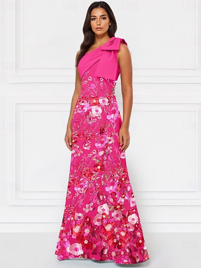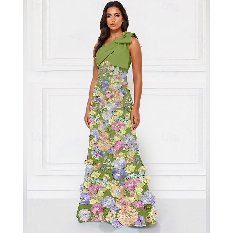 A-Line Evening Gown Elegant Dress Formal Wedding Floor Length Sleeveless One ShoulderDress Stretch Crepe with Bow(s) Embroidery Appliques 1
